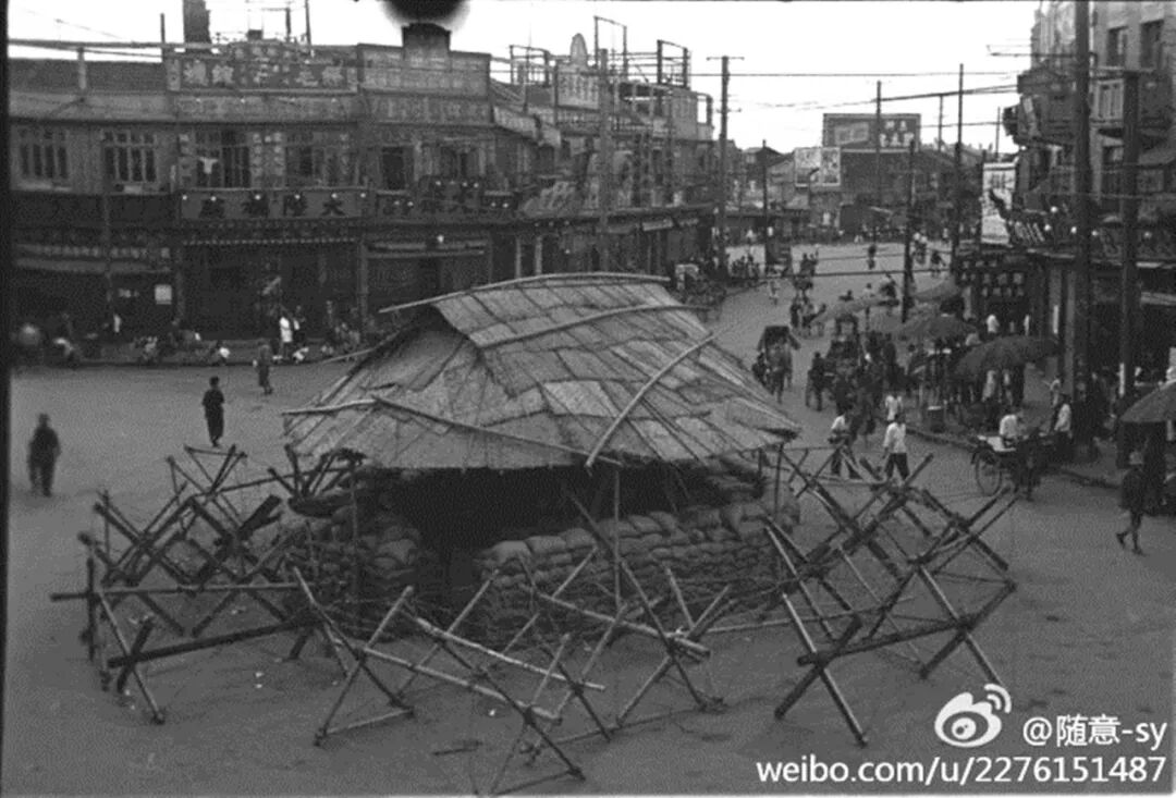 图412:1937年,曹家渡五角场街景,机位在沪西中华大戏院门口,镜头对着白利南路(长宁路)、极司非尔路(万航渡路)、无名小路(1943年后名长宁支路)围成的岛型(永源里)建筑一侧街面房,近处右侧为极司非尔路(万航渡路)及其支路(万航渡后路)口。沪西中华大戏院对面岛型街面房可见大陆袜厂、天禄号等商铺(图via随意兄)