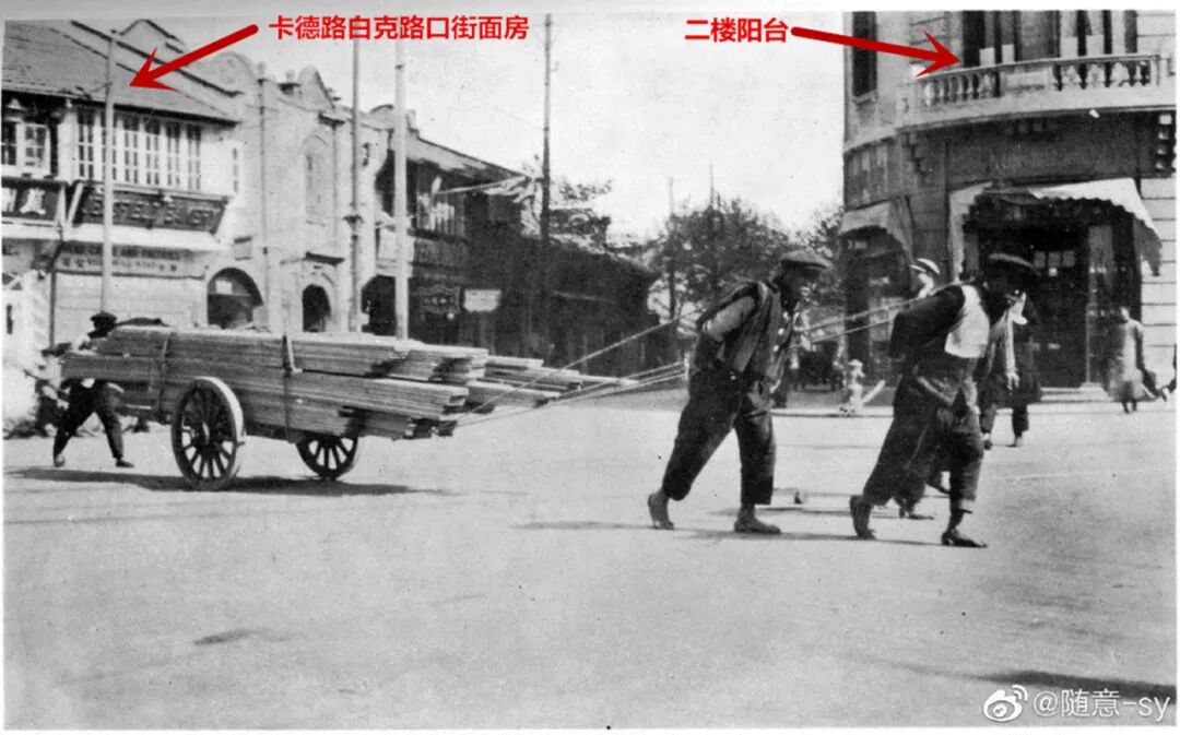 图417经与图415、图418两图比对后确认,其右侧有阳台的为四明银行大楼,左侧则为卡德路白克路口街面房(图中红箭头所示)。这种多图比对是辨认老照片常用且有效之方法。在图418、419中发现四明银行大楼(静安寺路764号,四明银行西区支行,边门由白克路进)西端二楼没有阳台了,三楼顶上大晒台的围栏装饰也有变动。大楼改造时间有待考证。在图415中左前可见夏令配克大戏院侧影,尽管片子不够清晰,但大致轮廓还能辨认出来。经与1926年之后的夏令配克(EMBASSY THEATRE )老照片仔细比对辨认,此楼为1926年之前建造的早期夏令配克(OLYMPIC THEATRE)。另,片中夏令配克对面那几幢洋楼(图416),也是有故事的,有待考证。在图420中,可见德义大楼街面的南京理发公司(1933年3月8日开幕)、科发大药房、上海电力公司等。