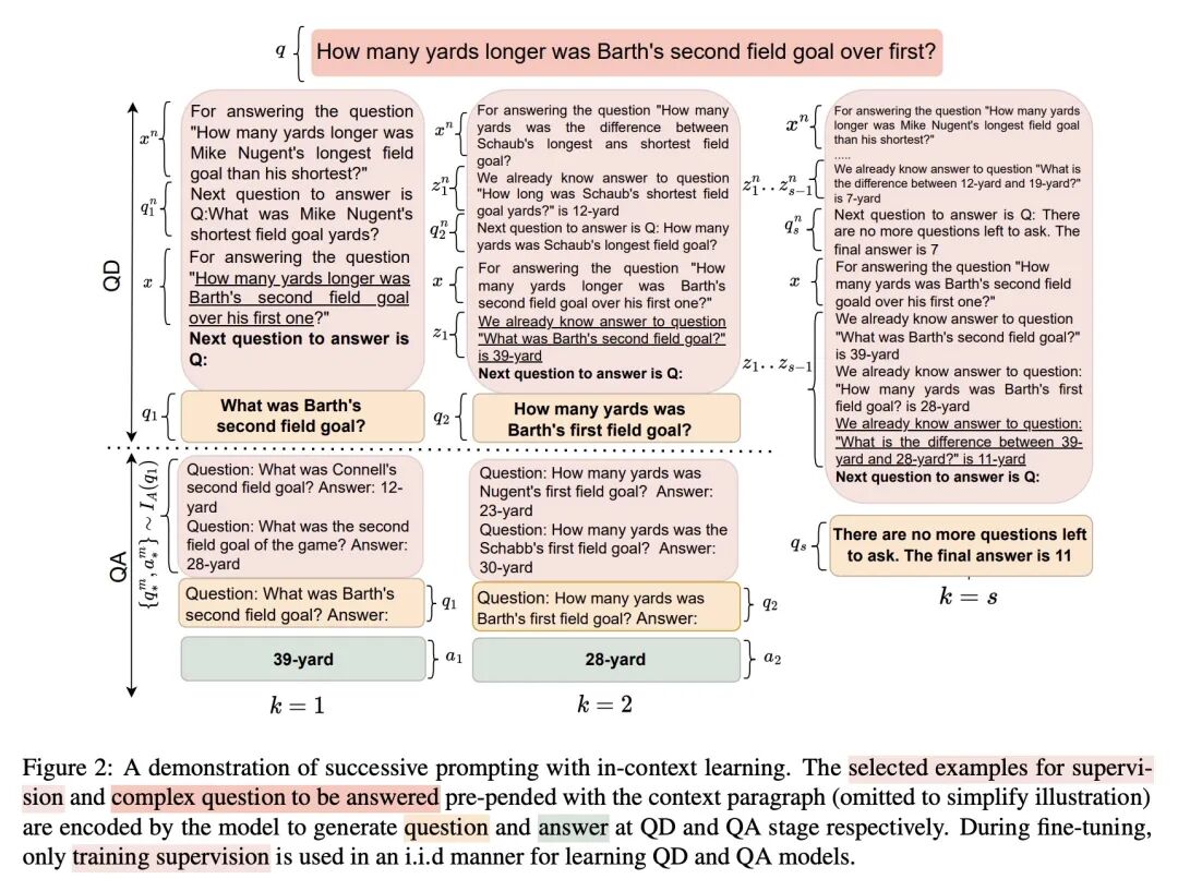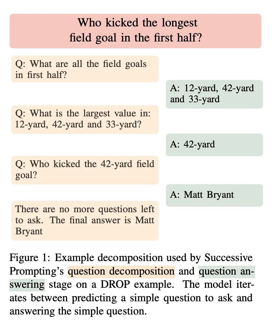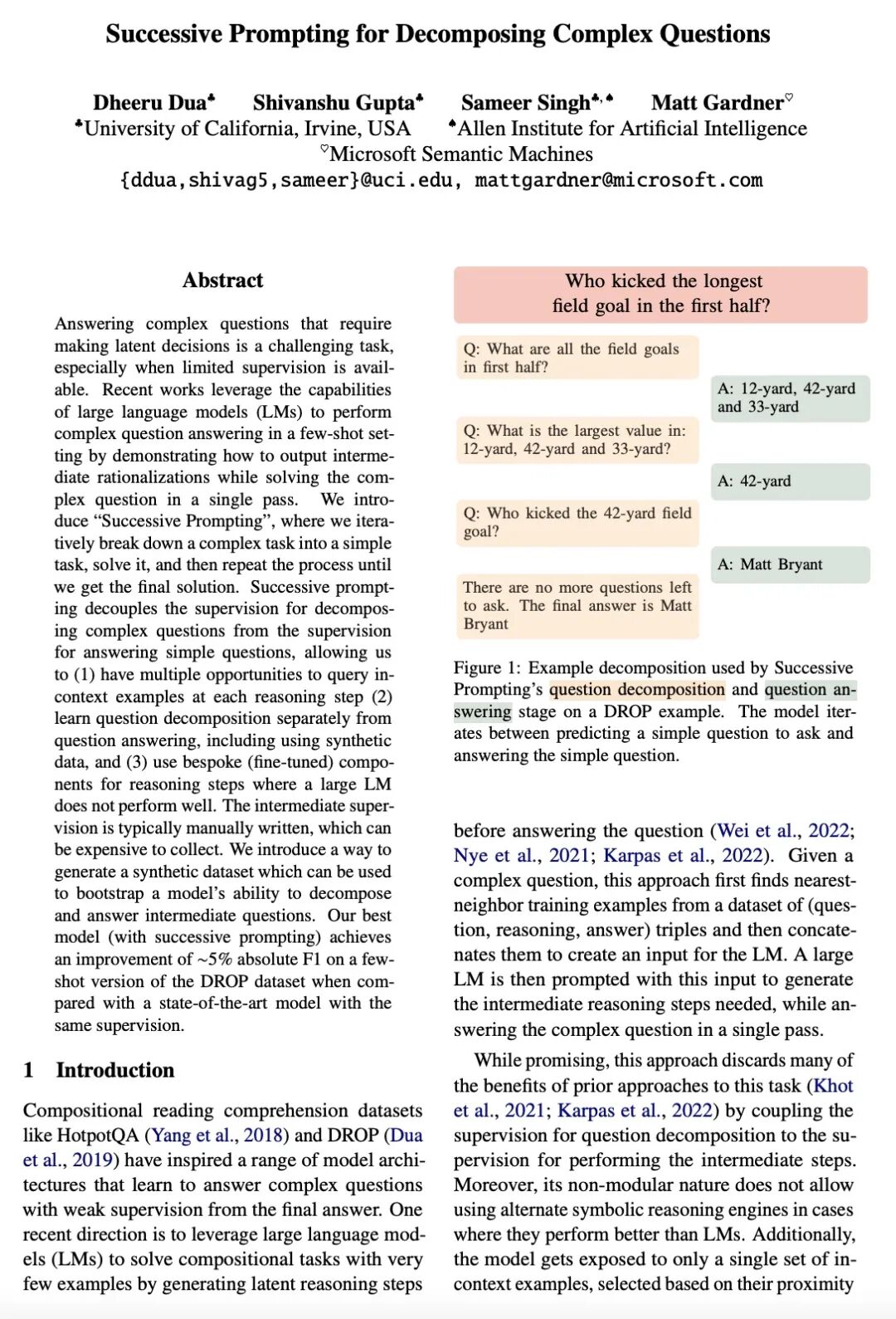 回答需要做出潜在决策的复杂问题是一项具有挑战性的任务,尤其是在监督有限的情况下。最近的工作利用大型语言模型(LM),通过演示如何在单次解答复杂问题的同时输出中间合理化,在少样本情况下执行复杂的问答。本文提出“连续提示”,将一个复杂的任务迭代地分解成简单任务并寻求解答,重复该过程,直到得到最终解答。连续提示将分解复杂问题的监督与回答简单问题的监督分开,使得能够 (1)在每个推理步骤中有多个机会查询上下文中的示例 (2)问题分解学习与问答学习分开,包括使用合成数据,以及 (3)在大型语言模型表现不佳的情况下使用定制(微调)组件进行推理步骤。中间监督通常是手动编写的,收集起来可能很昂贵。本文提出一种生成合成数据集的方法,该数据集可用于引导模型分解和回答中间问题的能力。与具有相同监督的最先进模型相比,最好的模型(基于连续提示)在 DROP 数据集的少样本版本上实现了约 5% 的绝对 F1 改进。