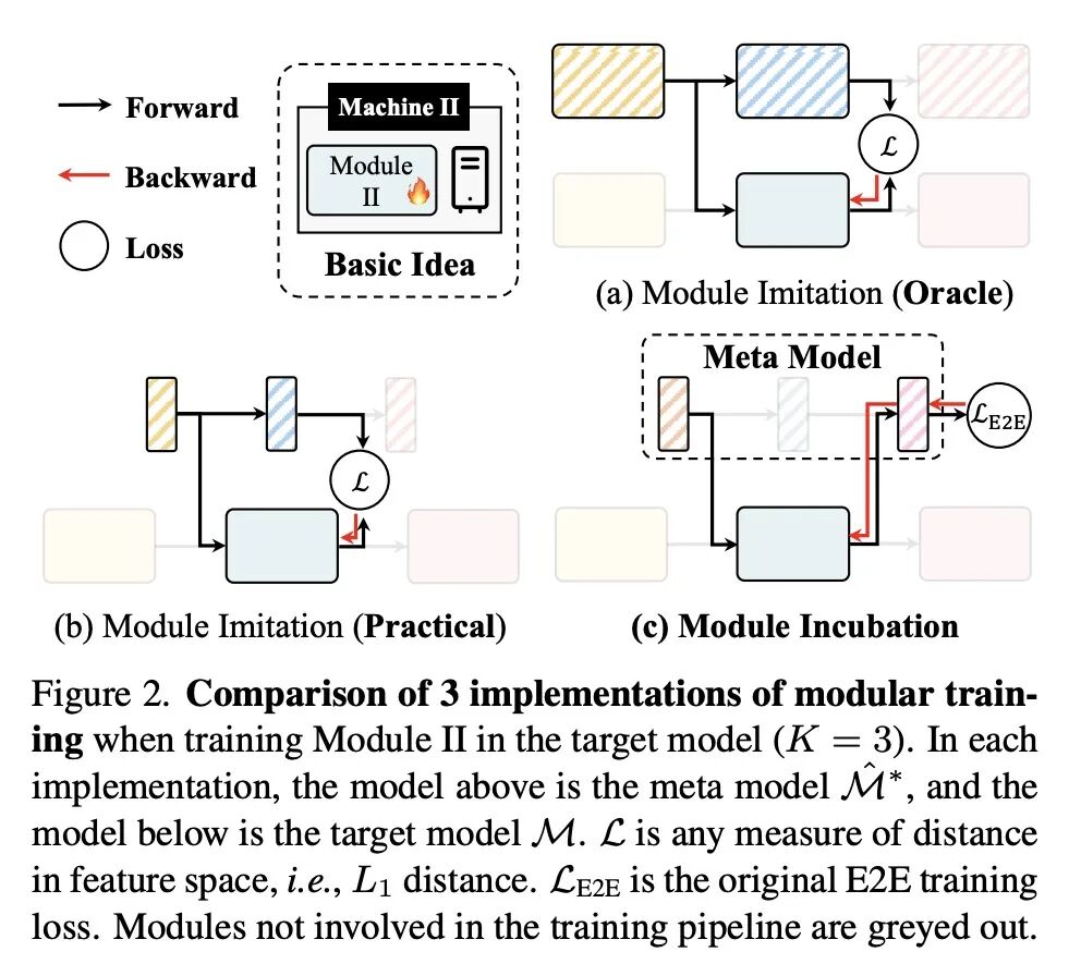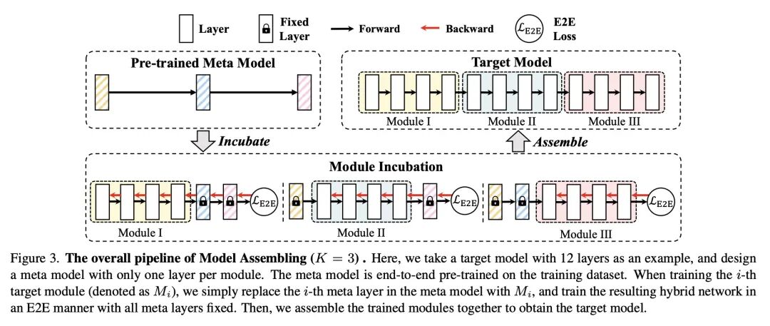 为降低训练成本减少过拟合,采用分而治之的策略,将大模型分成小模块,独立训练,再重新组装得到目标模型。通过全局共享元模型来隐式地将所有模块链接在一起,以保证独立训练模块的兼容性。实现了高性能和高效率的完全分布式训练,在计算和数据方面都显著优于端到端训练。