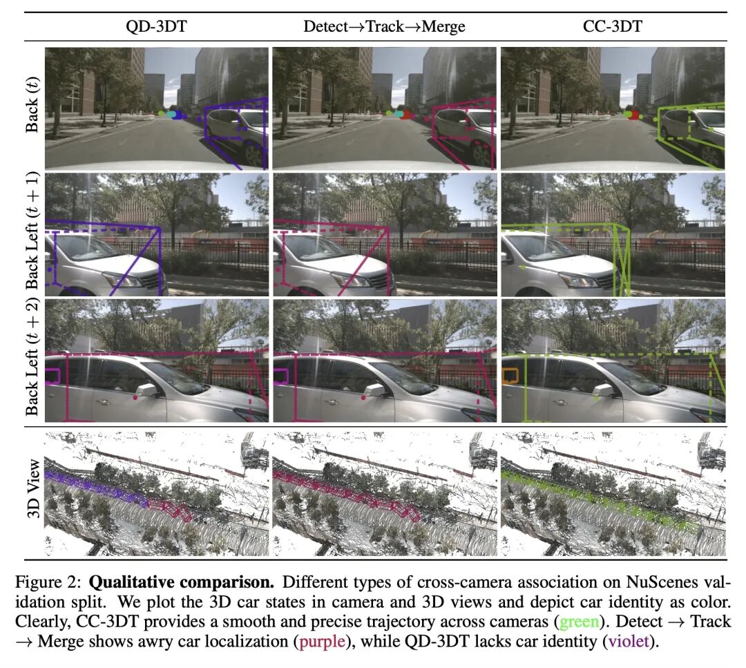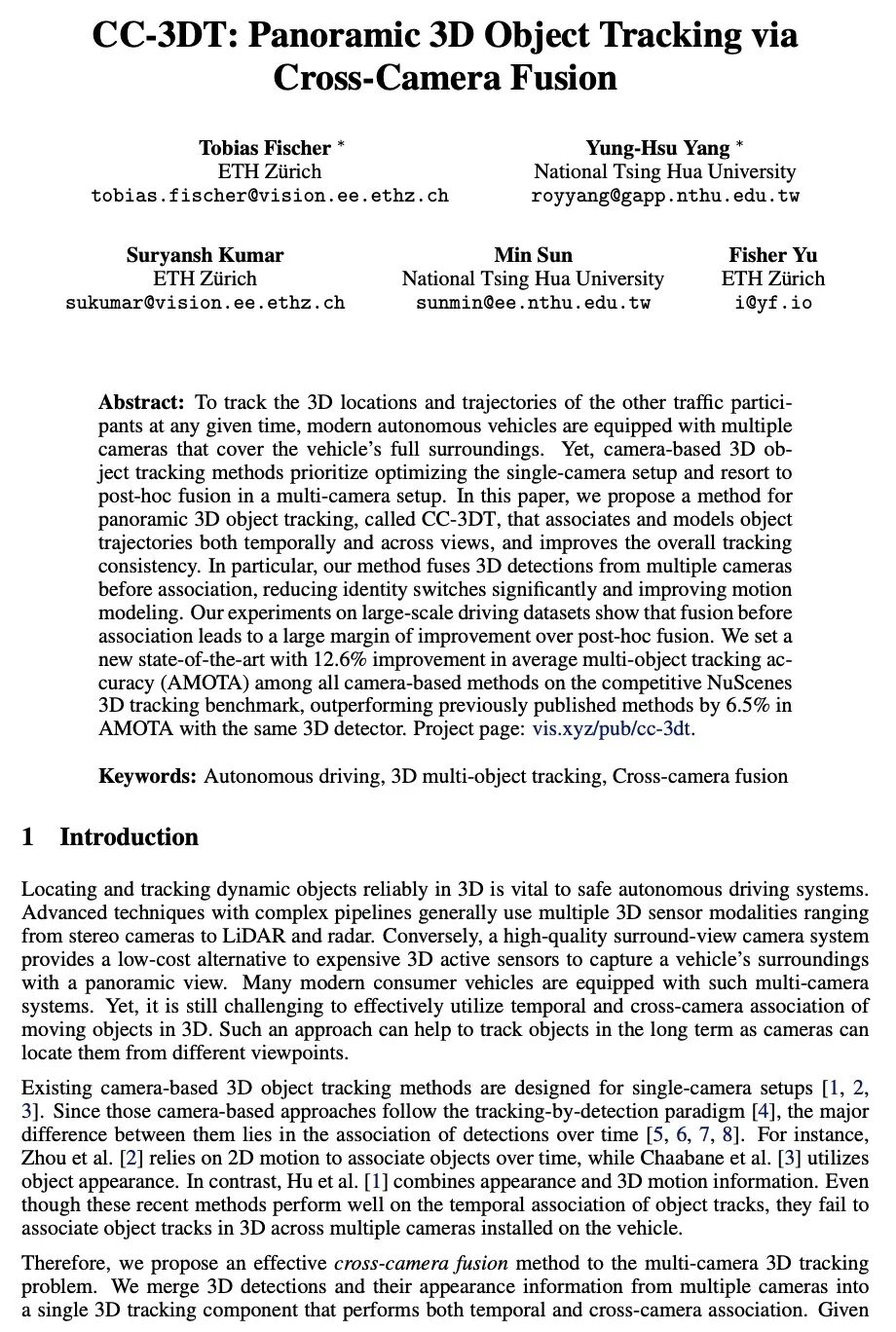 CC-3DT提供了一种全景3D目标追踪方法,在关联之前融合来自多个相机的 3D 检测,以减少身份切换提高运动模型质量,可实现更好的目标关联和更平滑的轨迹。