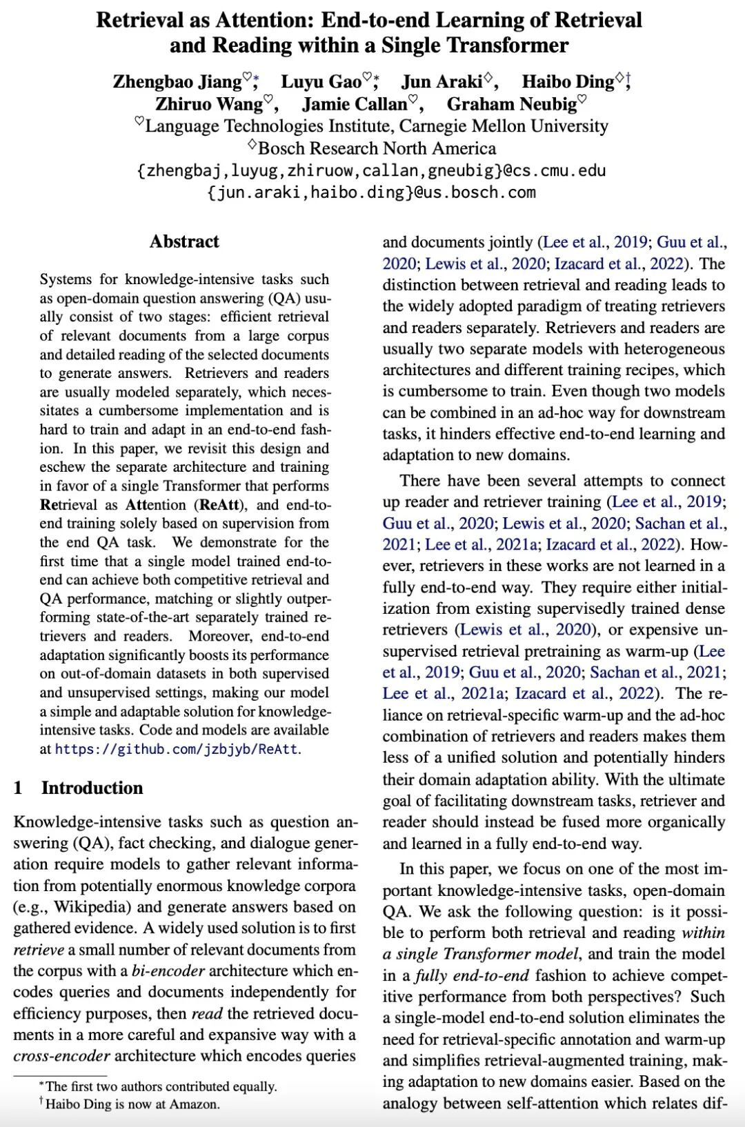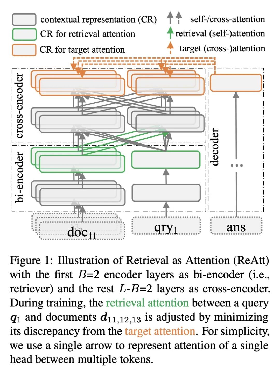 用于知识密集型任务的系统,如开放域问答(QA),通常包括两个阶段:从大型语料库中有效地检索相关文档,并详细阅读选定文档以生成答案。检索器和阅读器通常是分开建模的,这就需要繁琐的实现,而且很难以端到端方式进行训练和调整。本文重新审视了这种设计,摒弃了单独的架构和训练,而采用了一个执行检索即注意(ReAt)的单个Transformer,以及完全基于终端QA任务的监督的端到端训练。本文首次证明,一个端到端训练的单一模型可以实现有竞争力的检索和QA性能,与最先进的单独训练的检索器和阅读器相匹配或略胜一筹。此外,在有监督和无监督的情况下,端到端的适应性大大提升了其在域外数据集上的性能,使该模型成为知识密集型任务的简单和可适应的解决方案。