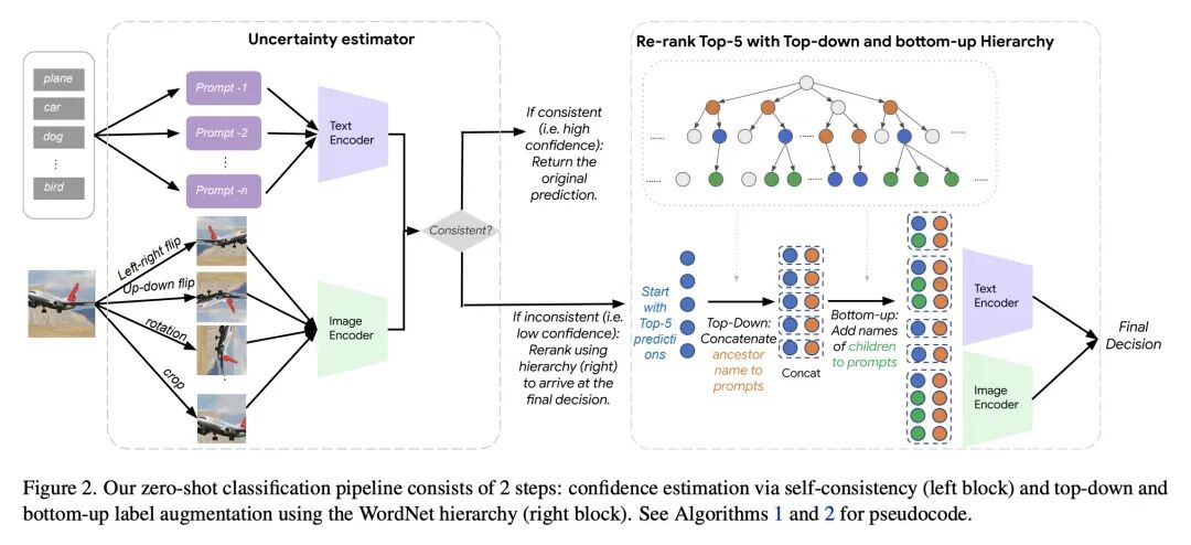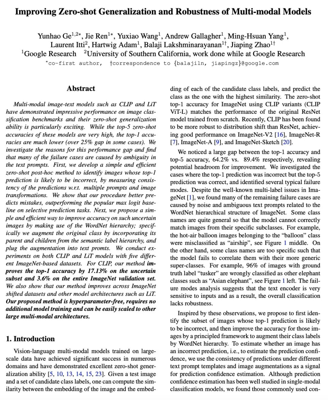 CLIP 和 LiT 等多模态图像-文本模型在图像分类基准上表现出了令人印象深刻的性能,其零样本泛化能力尤其令人兴奋。虽然这些模型的top-5零样本准确率非常高,但top-1准确率要低得多(在某些情况下差距超过 25%)。本文调查了造成这种性能差距的原因,发现许多失败案例都是由文本提示中的歧义引起的。本文提出一种简单有效的零样本事后方法,通过测量在多个提示和图像变换上的预测一致性来识别其top-1预测可能不正确的图像。 该程序可以更好地预测错误,在选择性预测任务上优于流行的max logit基线。本文提出一种简单有效的方法来利用 WordNet 层次结构来提高此类不确定图像的准确性,通过从语义标签层次结构中合并其父类和子类来扩充原始类,并将扩充插入文本提示中。用五个不同的基于 ImageNet 的数据集对 CLIP 和 LiT 模型进行实验。对于 CLIP,该方法在不确定子集上将 top-1 精度提高了 17.13%,在整个 ImageNet 验证集上提高了 3.6%。该方法在 ImageNet 移位数据集和其他模型架构(例如 LiT)中得到了改进。所提出的方法是无超参数的,不需要额外的模型训练,可以很容易地扩展到其他大型多模态架构。