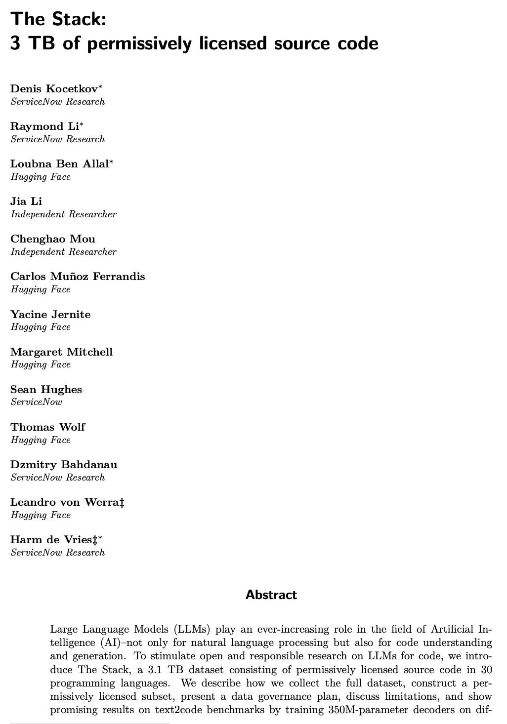 The Stack是一个3.1TB的数据集,由30种编程语言的自由授权源代码组成,实验表明,近似重复数据删除是获得有竞争力的结果的重要预处理步骤。未来的计划涉及删除 PII 和恶意代码的方法,以及支持开发人员将其数据从数据集中删除。