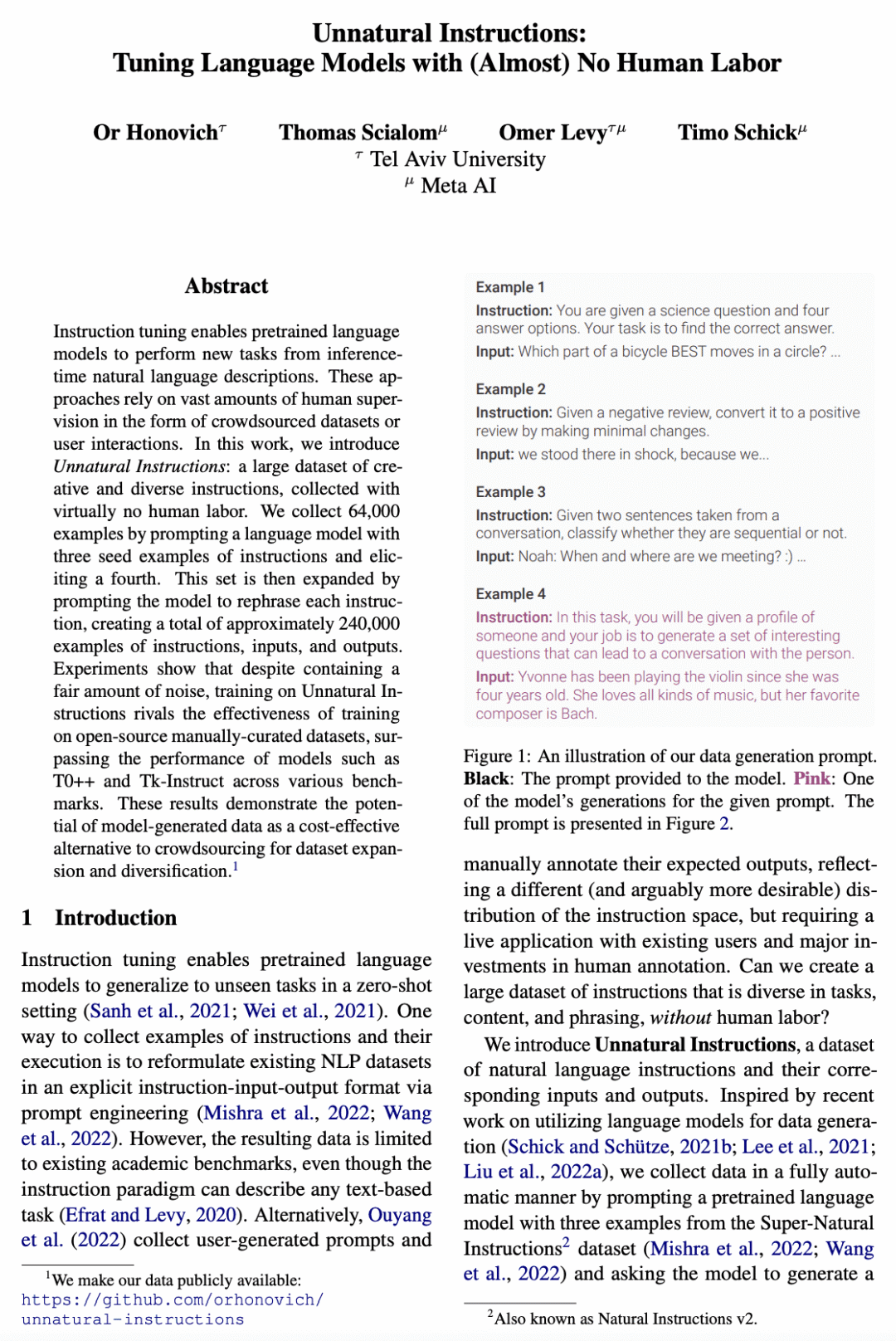 指令微调使预训练语言模型能够从推理时自然语言描述中执行新的任务。这些方法依赖于大量的人工监督,其形式是众包数据集或用户交互。本文提出"非自然指令"(Unnatural Instructions):一种由创造性和多样性指令组成的大型数据集,几乎不需要人工来收集。通过向语言模型提示三个种子指令的样本并激发第四个样本来收集64000个样本。通过提示模型对每条指令进行重新措辞,以扩大这一集合,创造了大约24万条指令、输入和输出的样本。实验表明,尽管包含相当数量的噪音,但在Unnatural Instructions上的训练可与在开源的手工编制的数据集上的训练效果相媲美,在各种基准上超过了T0++和Tk-Instruct等模型的性能。这些结果证明了模型生成数据作为众包数据集扩展和多样化的一个具有成本效益的替代方案的潜力。