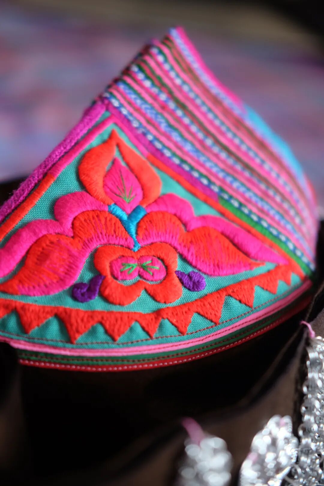 头饰上绣片的灵感来源于展翅的蝴蝶和桃心, 寄托了美丽和喜庆之意