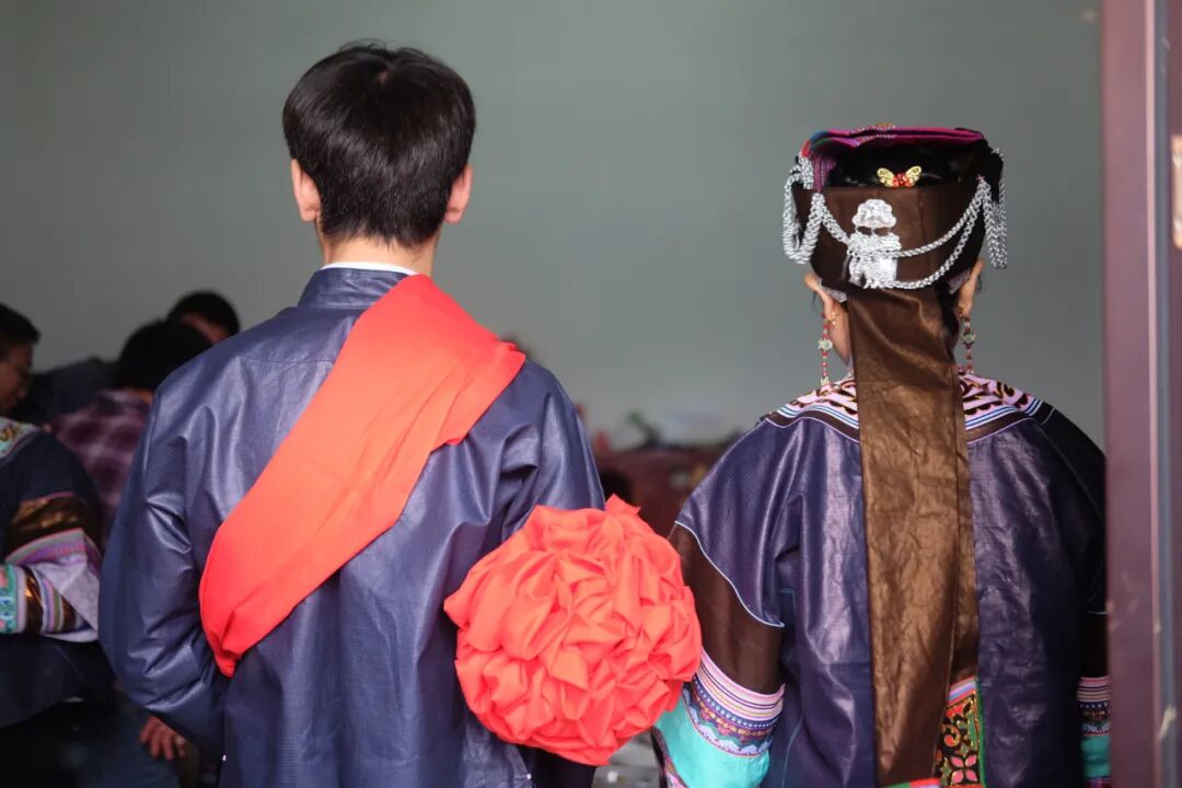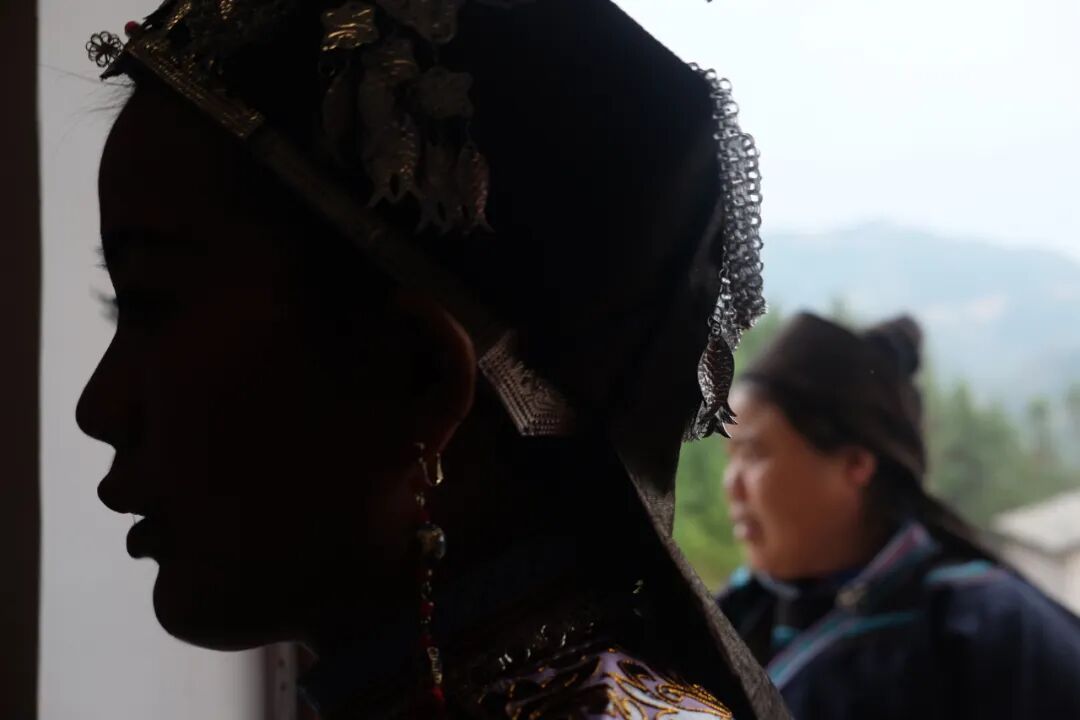 我跟着送菜的人来到席间,妇女们都穿着传统服装,深深浅浅的蓝色,粉色包头下露出朴素的银饰。她们年少时一定也经历过这样的时刻,如今背着一个牵着一个,怀里还坐着一个。代代的繁衍,便如岁岁焕新的青松。一个大哥招呼我给他拍照,却觉得我拍下的那张构图和色调都没问题的照片“不好看”,接着他回座位招呼大家举杯联欢,笑着给我说,这样才叫好看——他们所认同的好看,是大家开心地在一起。![]()