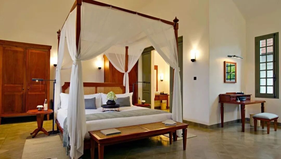 24间套房运用优质木料与殖民风格家装,以高挑通透室内空间轻松容纳唯美四柱床榻。
