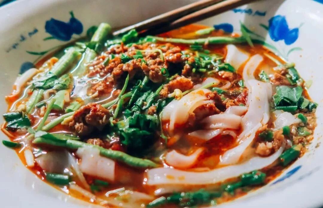 老挝米粉在当地叫做Khao Piak Sen,使用厚的、手擀的面条,把汤料里的面条焯一下,但不去掉面条上的淀粉,这样汤汁的厚度几乎和肉汁一样厚——而不是典型的稀汤。