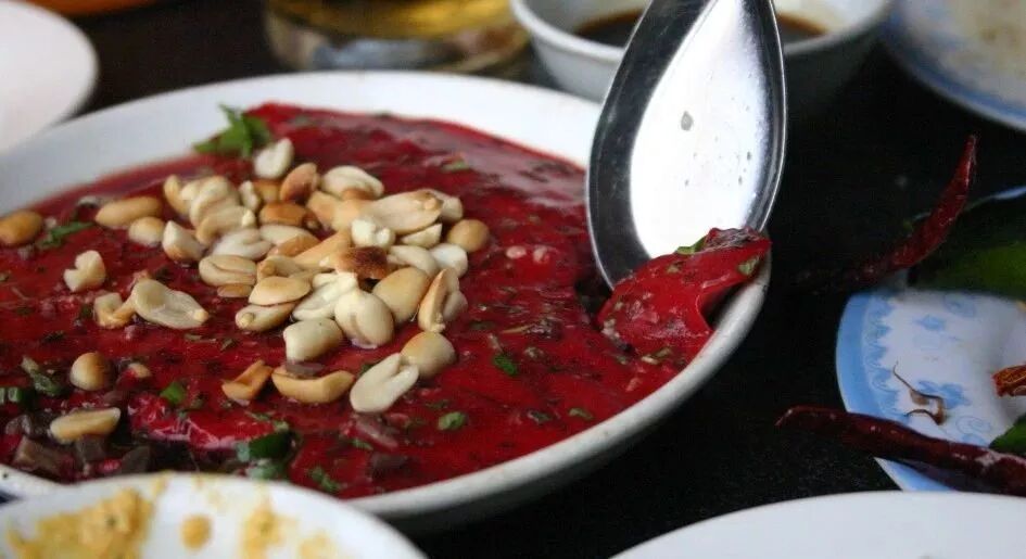 在老挝,你经常可以看到人们生吃鸭血,甚至是猪血或者山羊血。鸭血混合煮熟的碎鸭和内脏,与薄荷、葱花等搅拌,再添上酸橙汁。对当地人来说,每一口都是享受。(重!口!味!)