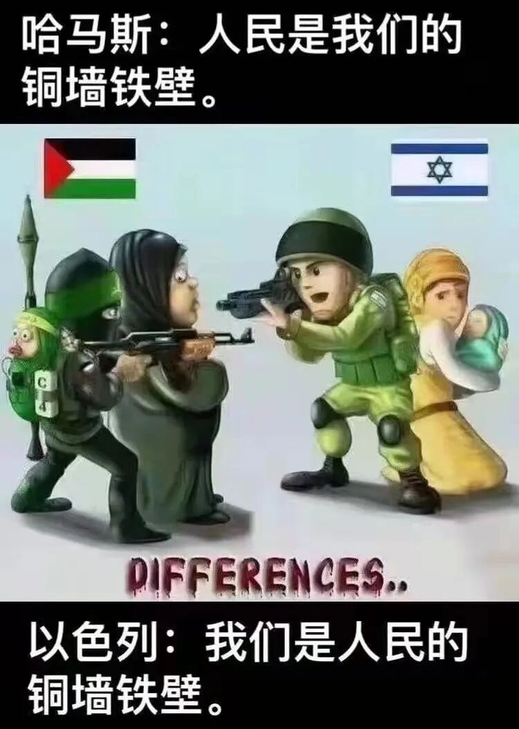 最近这两天有张配文字的漫画正在朋友圈刷屏:漫画里哈马斯说:人民是我们的铜墙铁壁;以色列说:我们是人民的铜墙铁壁。