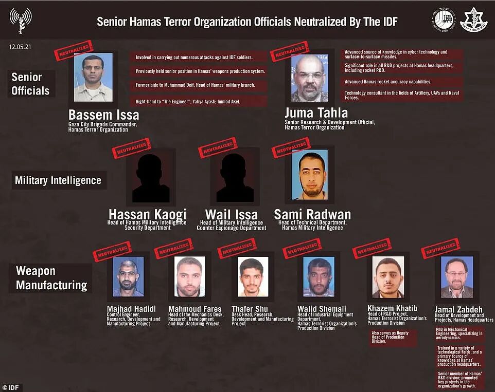 据以色列国防军称,6名哈马斯高级指挥官和5名关键人物被炸死,其中包括哈马斯火箭部队负责人巴塞姆·伊萨准将和该集团火箭部门负责人贾马尔·扎布达。