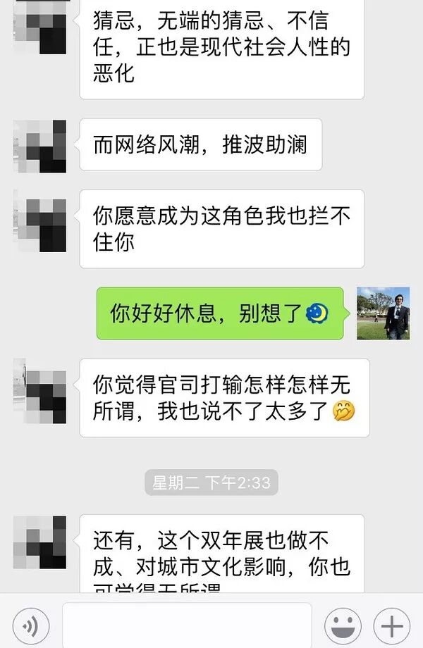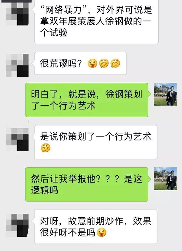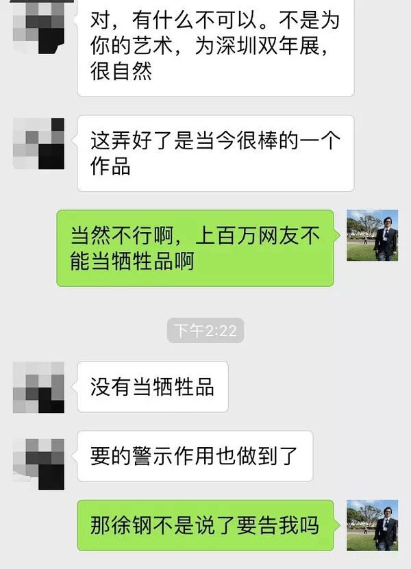 图中说,本周三将正式起诉我。要传达的讯息是如果想撤还来得及,到了周三就等着应诉诽谤吧。张尔问事情已经闹大,怎么可能说撤就撤,L女士说了徐钢的解决办法,让王敖发声明,说整个事件是徐钢参与的深圳双年展的一个行为艺术,用这个事件展示一个善良无辜的大学教授是如何被污名化的。事后,张尔觉得实在不可思议,并很快跟我通了语音。
