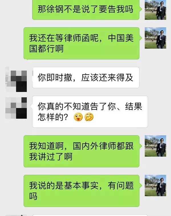 我来解释一下,徐钢说的周三提告并没发生。我在中国和美国都做好的应诉的准备,中国是北大95级法律系同学的律所,美国是耶鲁法学院朋友推荐的律师,我们做好了准备。迄今为止,还未接到徐钢方面的律师函。