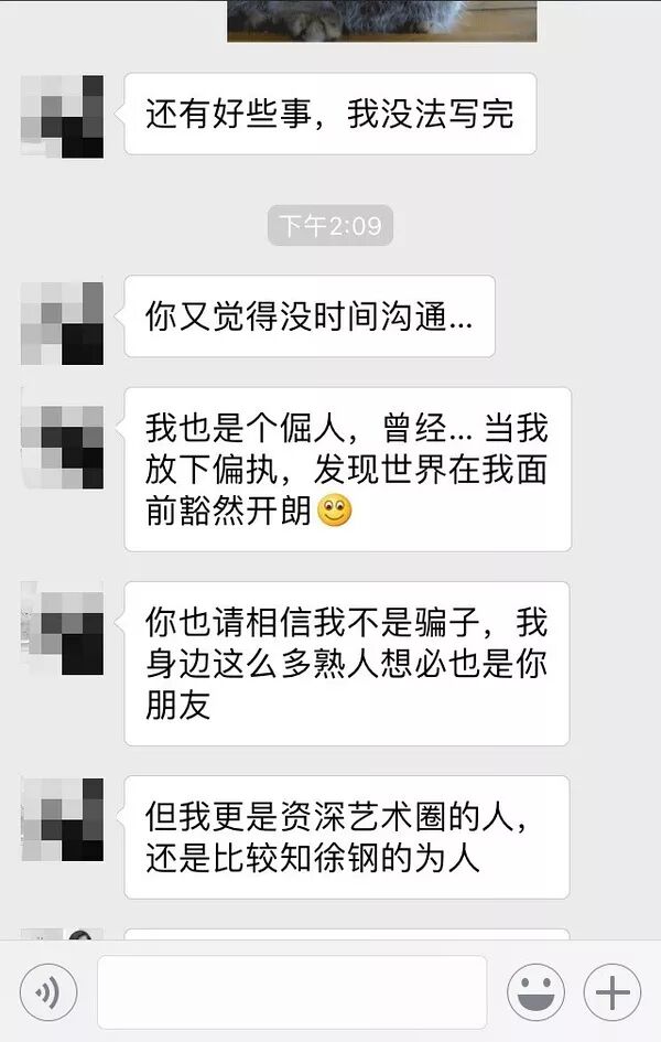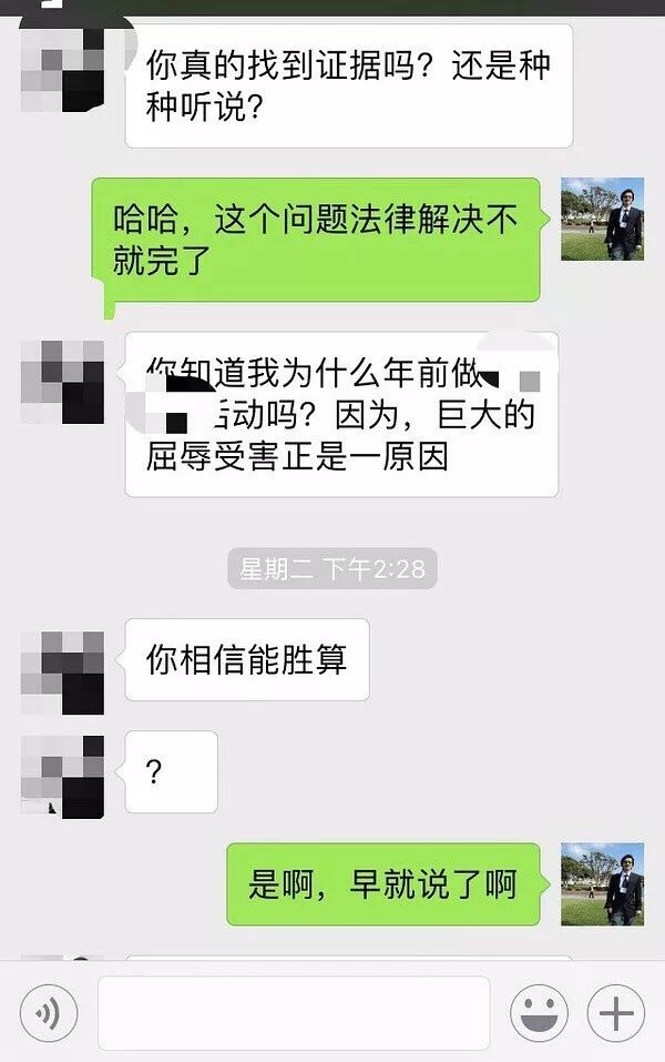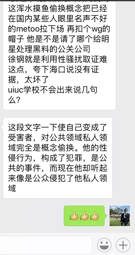 我觉得击碎他谣言的目的已经达到,就没继续更新,而是发了李晋教授谈自己实名举报经历的文章。即使打码,我也不想贴图,我去跟L女士共同加入的一个群,不点名地说,有的群友还在为徐钢说话。我的希望是她能早点醒悟。