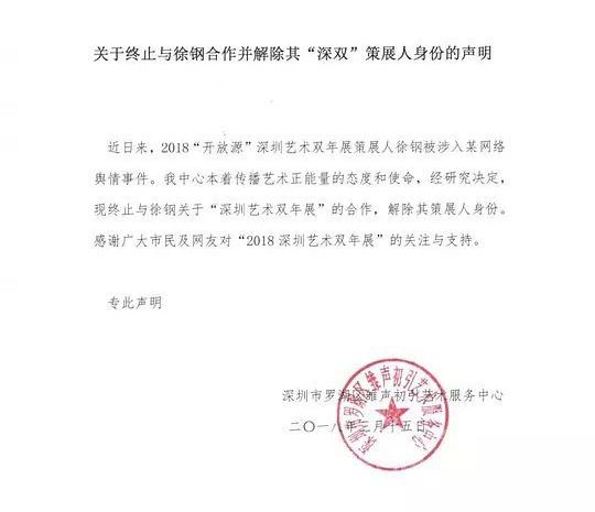 深圳市罗湖区雏声初引艺术服务中心公开声明,解除徐钢“深双”策展人身份,内容如下: