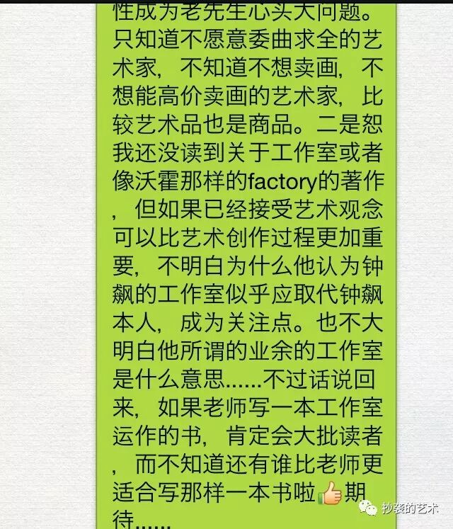 “看他无意中用“推销”来形容对他学生和艺术家的推介,也不难看出这个人是用什么样的心态在进行着他的所谓艺术工作。推销?销?看他怎样评价那些退出深圳双年展的艺术家:落井下石,忘恩负义。这样的字眼表明他根本没有把策展人和艺术家的地位平等化,他认为自己是在垂青眷顾这些艺术家,他忘了这些艺术家们才是这个行业的真正的创造者,艺术家不是被艺术产业驾驭的生产力,艺术家是创作和表达的人。”