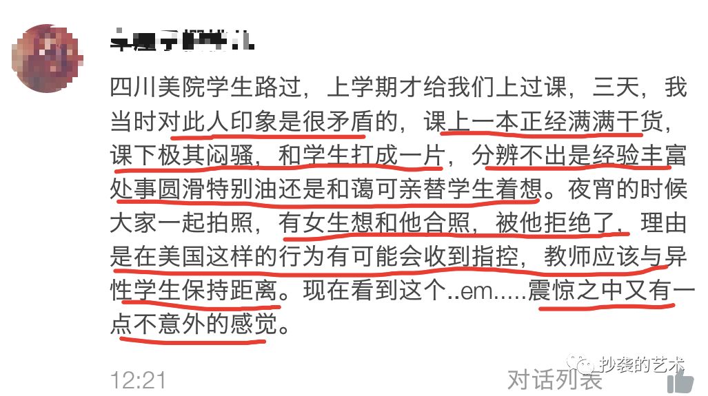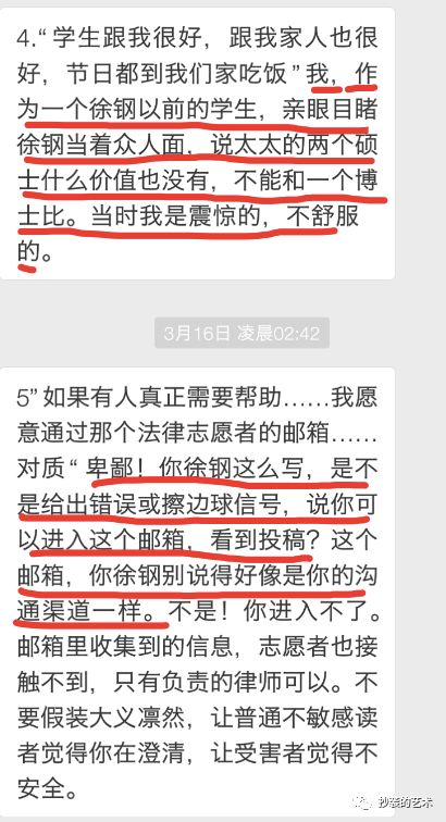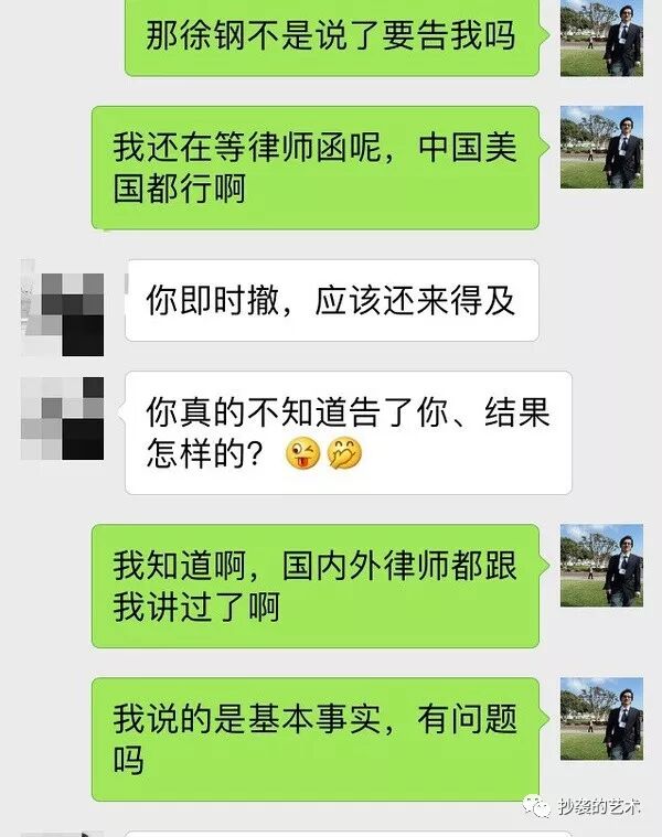 一周来,王敖教授作为冲在最前面的实名举报者,多次被徐钢及徐钢派来的人软硬兼施地威胁。(其中一部分截图请移步王敖教授图文翔实的文章:王敖:回应徐钢教授的声明,继续揭露他,并以实际行动制止网络暴力,支持深圳的艺术事业 )徐钢一面心虚拒绝媒体采访,一面暗处发力打击报复。高压政策无以复加,拉黑所有疑似不顺从的学生,同时逼迫很多人站队赞美他。正如艺术界回应中所说,如果能够拿出任何细枝末节的证据以鉴清白,徐钢必会跳出来回击。可是他选择的是继续在朋友圈圈地自吹,粉饰太平。相比之下,仅仅是这个提问下面,陆陆续续已有很多直接受害者、间接受害者、知情人表示愤慨,细节触目惊心。