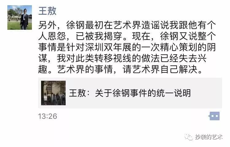 王敖发朋友圈表示:不要把事件引导到双年展以此来转移视线,还有艺术界的事情,请艺术界自己解决。