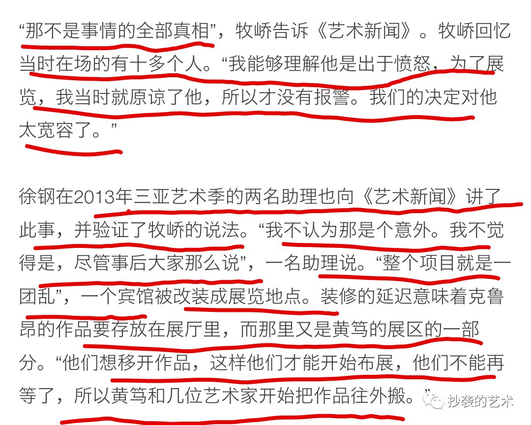 最近的报道也突出了2013年三亚艺术季期间发生的一件事情:徐钢打了他的共同策展人黄笃的女助理,牧峤。