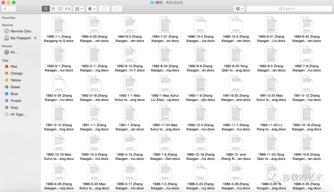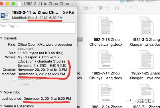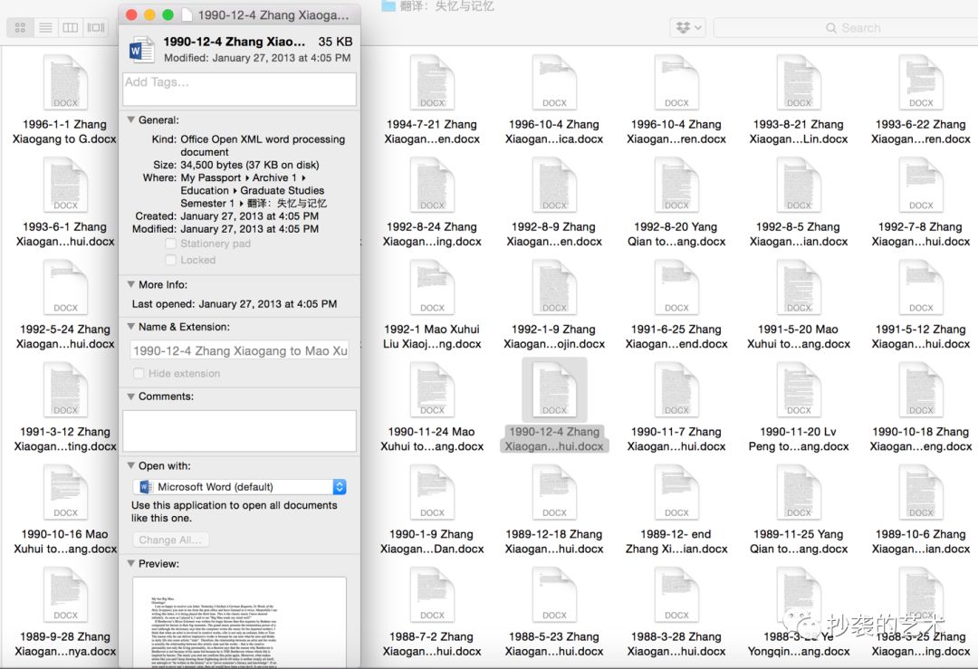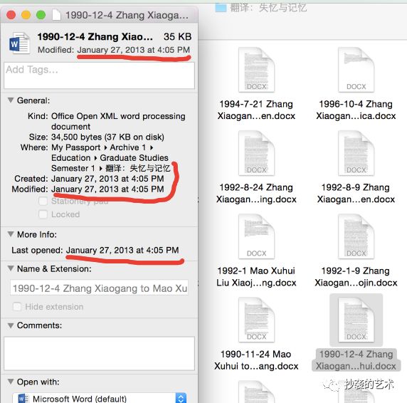 然而…我竟竟竟竟竟然发现了这么一个不属于徐钢的文件夹,里面密密麻麻都是翻译的张晓刚书信集,文档信息显示是2012年末。这个文件夹属于一位徐钢曾经的学生。这样完整翻译全书的文件夹,可能不止一个。出版书籍对于美国大学教授评职称非常重要,Phaidon不算传统的大学出版社,但是也有一定权威性,依然值得宣传和骄傲。通读全书,没有找到“鬼作者”(ghost writer)徐钢的名字,哪怕出现在感谢中。这么看来,徐钢还真是白捡了一个作者身份。