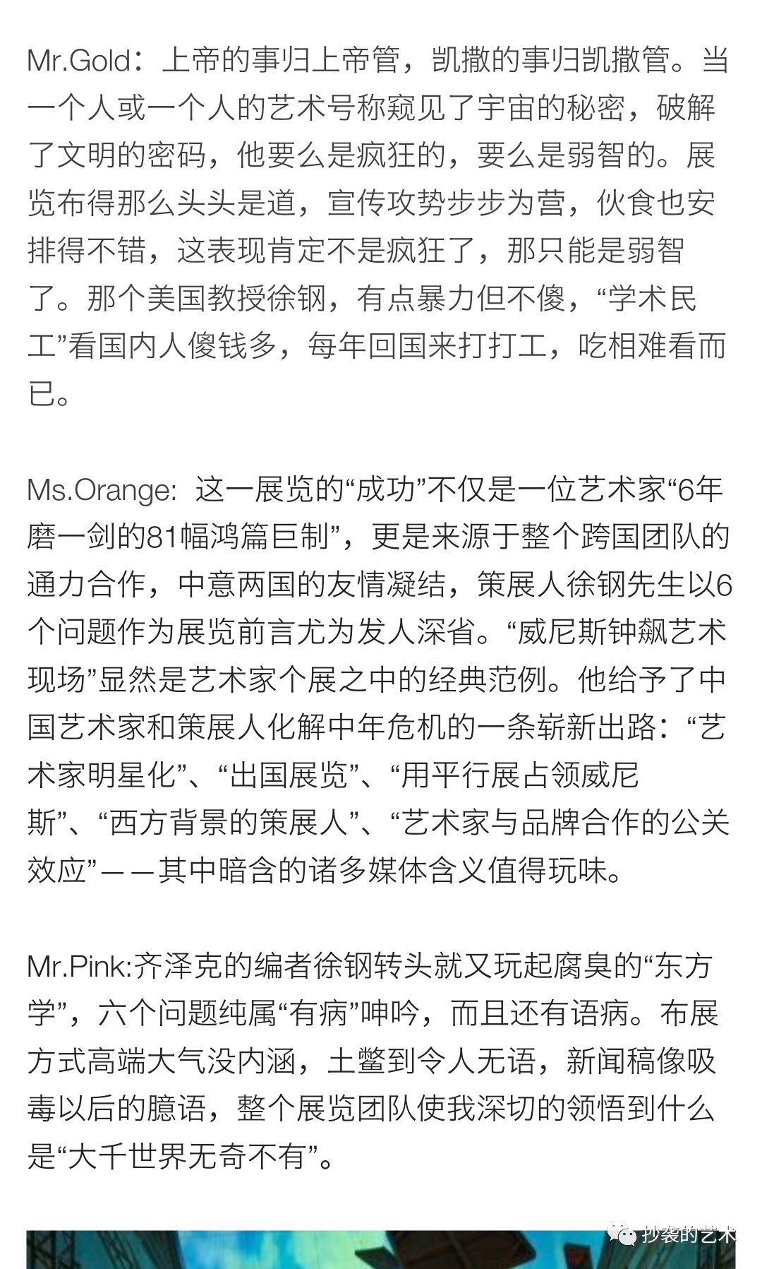 Mr.Gold:上帝的事归上帝管,凯撒的事归凯撒管。当一个人或一个人的艺术号称窥见了宇宙的秘密,破解了文明的密码,他要么是疯狂的,要么是弱智的。展览布得那么头头是道,宣传攻势步步为营,伙食也安排得不错,这表现肯定不是疯狂了,那只能是弱智了。那个美国教授徐钢,有点暴力但不傻,“学术民工”看国内人傻钱多,每年回国来打打工,吃相难看而已。