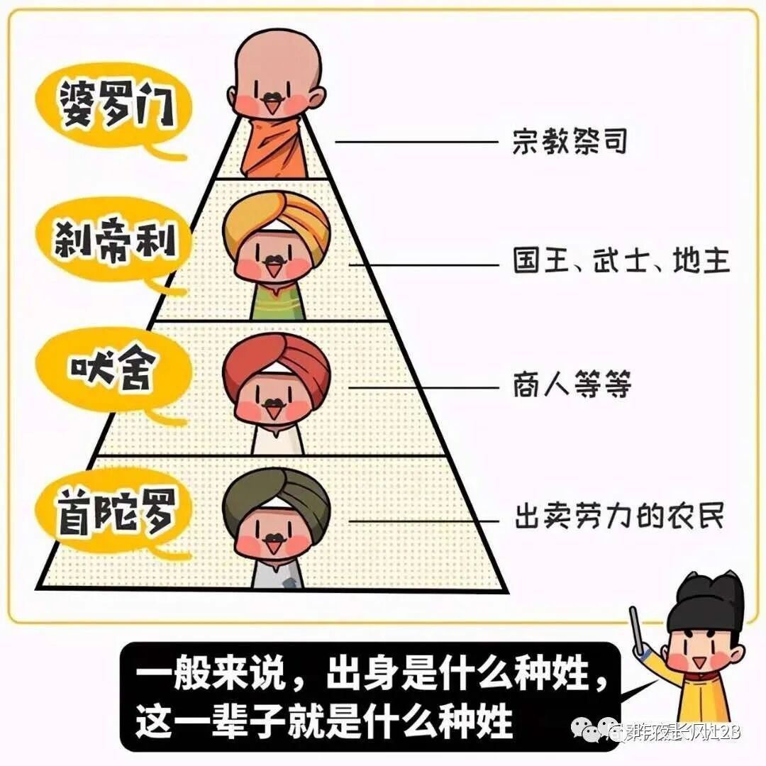 它是古代世界最典型、最森严的等级制度。印度人出生是什么种姓,一辈子就是什么种姓,还不能互相结婚。