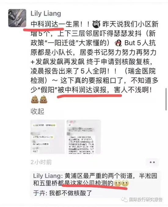目前,居委会已经决定更换掉中科润达。而吓人的是,在微博和朋友圈,凌通社看到,中科润达已经多次被指检测结果假阳性,结果就是居民莫名其妙去了方舱,小区莫名其妙被封控。润达医疗股市昨天涨停,晚上发布公告也没有说假阳性是怎么一回事。讲真我倒不认为有人恶意作假,只要把CT值提高,提高,再提高,提高到只要你有一点病毒就说是阳性,完事。