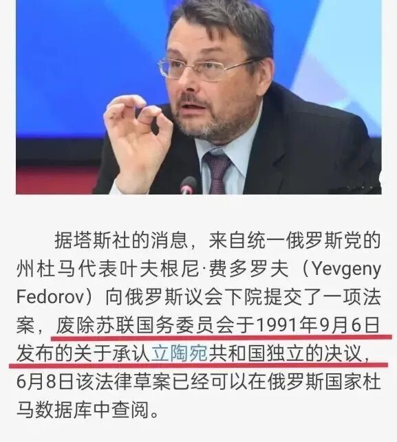 我们先来看一下参考消息网6月9日的最新报道:据塔斯社报道,来自统一俄罗斯党的俄国家杜马议员费奥多罗夫向国家杜马提交了法案,要求取消苏联国务委员会有关承认立陶宛共和国独立的决定,因为这一决定涉嫌违法。