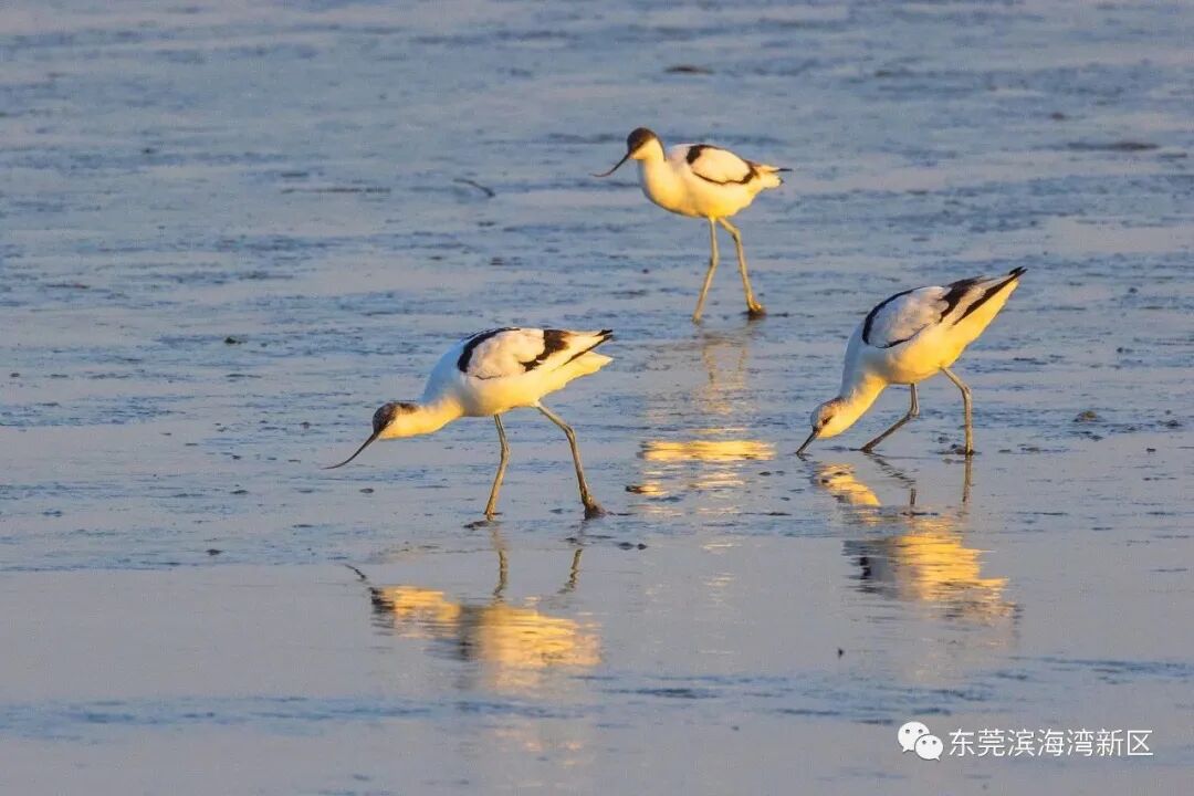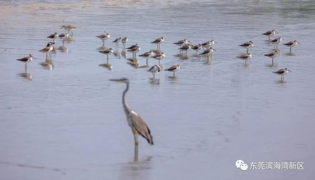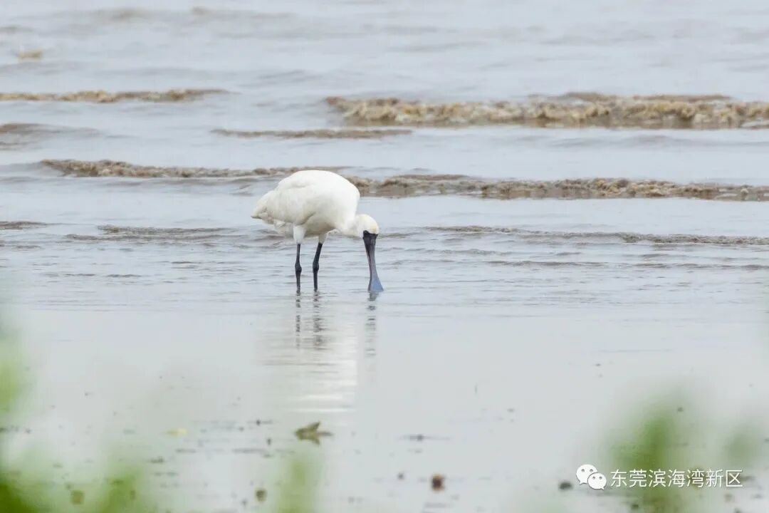 在候鸟成群飞来之时,“鸟中大熊猫”黑脸琵鹭也现身滨海湾,在滩涂浅水区“扫鱼”。黑脸琵鹭不仅是国家一级保护动物,同时也是世界级濒危物种之一,在全球数量大概只有几千只。它们飞行时姿态优美平缓,性情温顺。其扁平如汤匙状的长嘴,与中国乐器中的琵琶极为相似,故而得此名。![]()