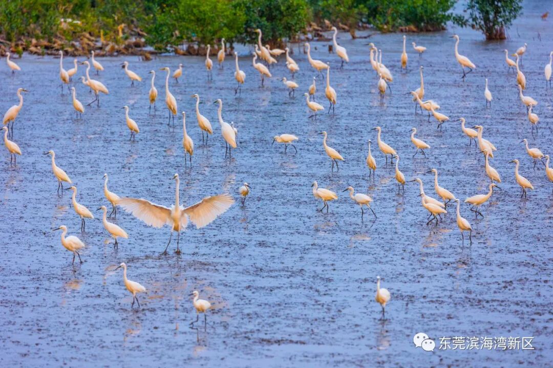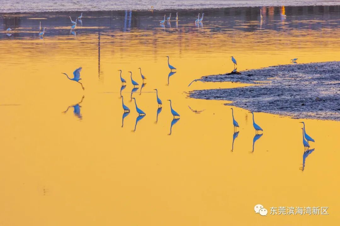 除了红嘴鸥,白鹭也是滨海湾的“老朋友”,秋冬时节,大、中、小白鹭都会陆陆续续结伴迁徙至此。