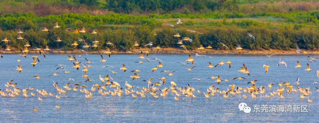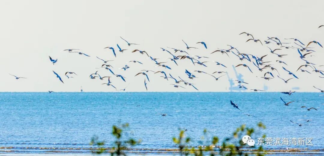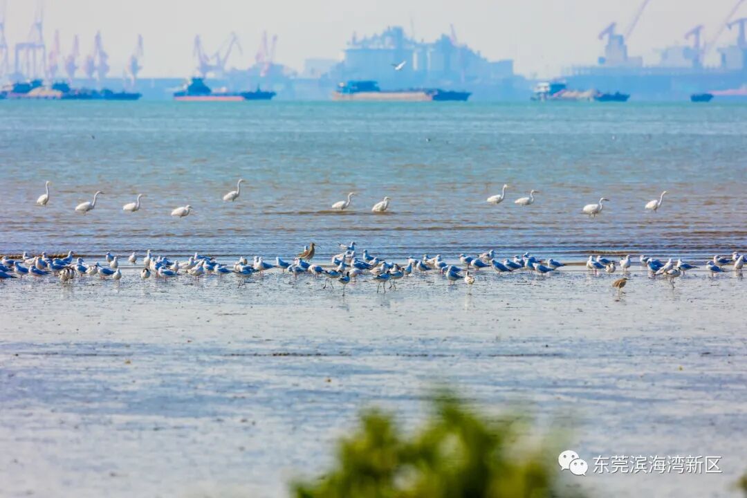 天气晴好时,海风阵阵,海水翻腾不息,红嘴鸥们也趁机舒展双翅“活动筋骨”。成群结队的红嘴鸥在低空盘旋,清亮的叫声响彻海边,好生喜悦。对岸,广州南沙港口忙碌的船只清晰可见,构成了一幅蓝色生态与蓝色经济和谐共生、活力迸发的画面。