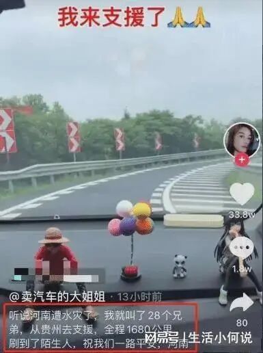 比如近日,某平台有10多万粉丝的女网红,为了蹭流量博关注,发布视频称“带了28个兄弟,从贵州前往河南支援。”