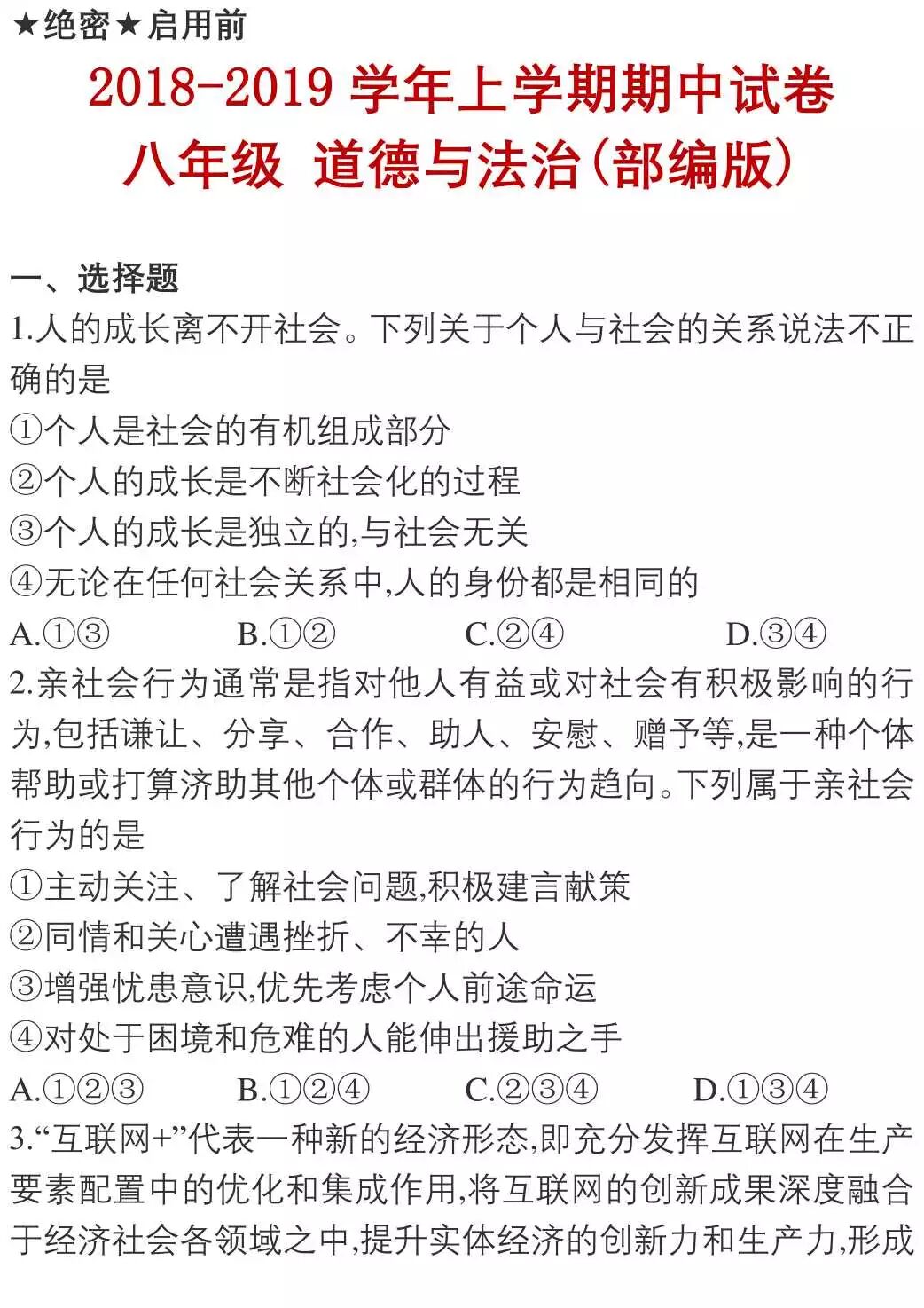 八年级上册道德与法制期中测试卷(部编版)(附答案)