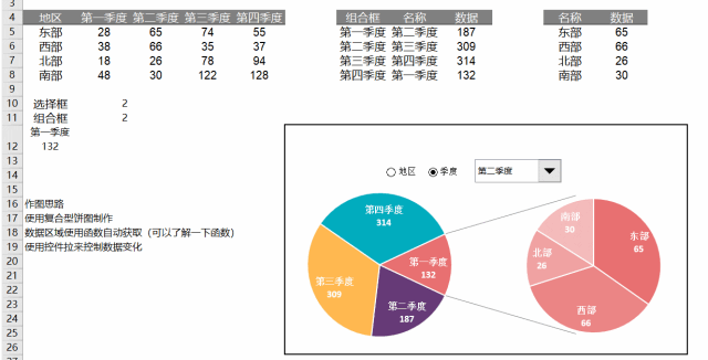 用复合型饼图来制作不同季度、不同区域的数据变化