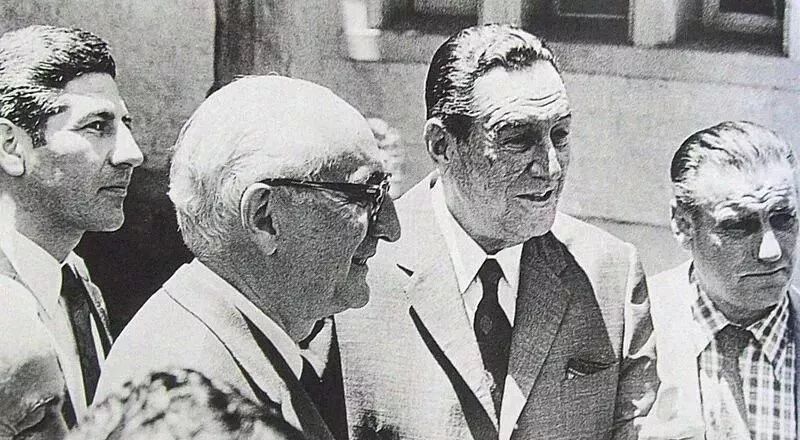 1946年6月4日,总统就职游行,贝隆总统(中)与副总统Juan Hortencio Quijanao(右)和Héctor Campora(左),在国会前合影。