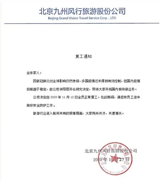 进退摇摆,直到10月27日,九州风行对员工发布了一份复工通知,通知显示,因新冠肺炎对全球影响仍然持续,多国疫情还未得到有效控制,但国内疫情目前趋于稳定,故公司领导层开会研究决定,带领大家开拓国内板块新业务,并决定自2020年11月12日全员正常复工。通知还提到“旅游业进入前所未有的艰难局面,大家同舟共济,共渡难关”。