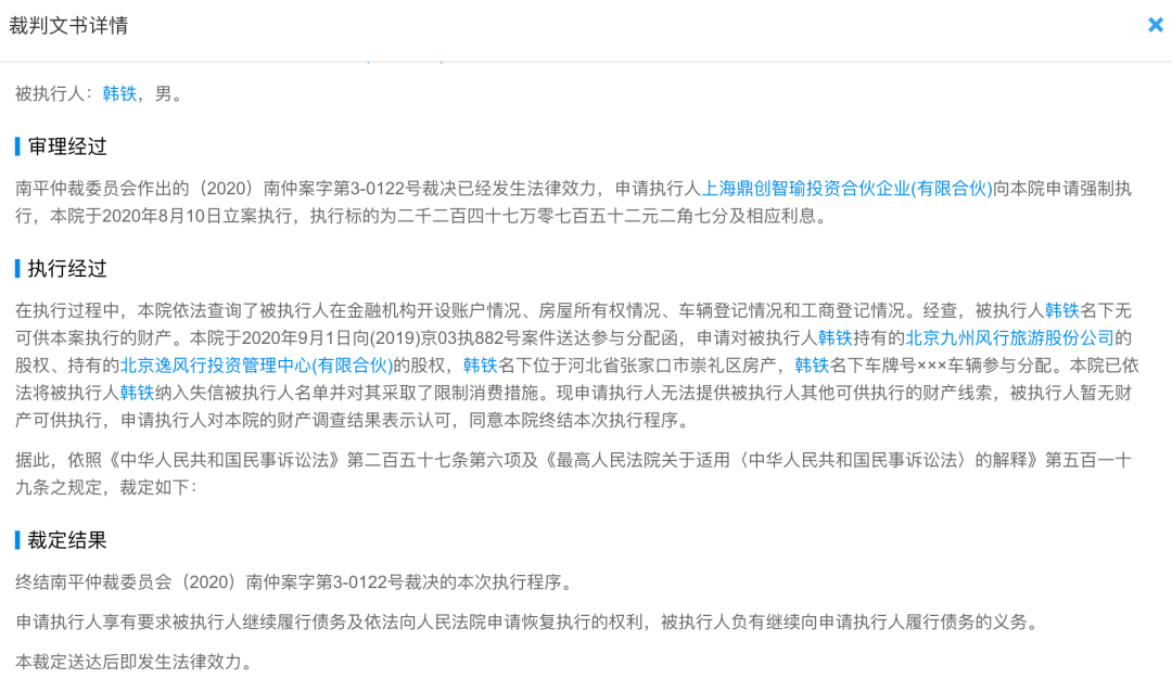 执惠26日查询企查查信息发现,韩铁在今年9月3日被列为失信被执行人,被限制消费。执行标的超过2247万元。