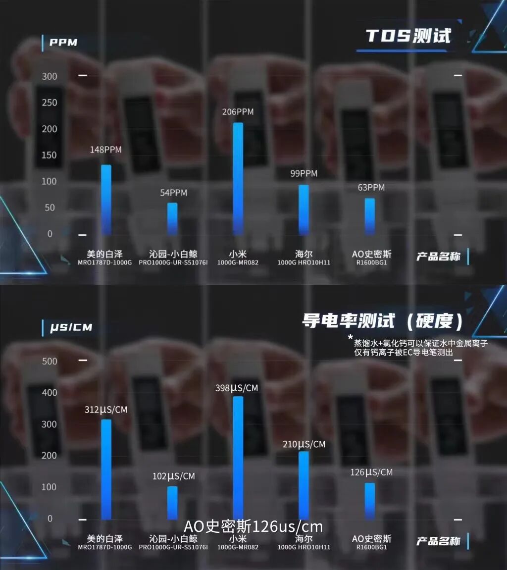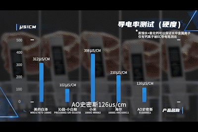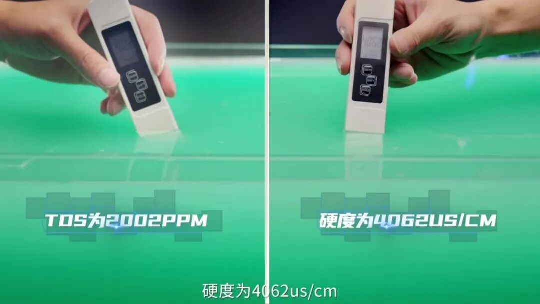 看起来纯净的水,就真的纯净吗?以常见的钙镁离子留存问题举例。爱喝热水的人们,时常会发现水壶中存在水垢,其背后的原因在于水中钙镁离子含量过高,即俗称的水质硬,而这类水的饮用口感较差。净水器产品的诞生,就是以净水为目标。一些花里胡哨的功能、外观都是次要选项,决定净水器产品力的核心性能指标,一定是净水性能。一台真正优秀的纯水净水器,完成净化的水就应该纯净。为此,我们使用不含任何金属离子的蒸馏水作为基础水样,定向增加污染物,(蒸馏水+氯化钙可以保证水中金属离子仅有钙离子被EC导电笔测出)。看看这五台机器在高浓度污染的情况下,能达到怎样的净滤效果。先说两个小知识,大家日常较熟知的水质衡量标准TDS,全称是Total dissolved solids,代表着水中溶解性固体物的总量。TDS数值越低,即代表水质越纯净。而水的“硬度”,如果可以确认水中只有钙离子的情况下,可以用检测水中导电金属离子含量的方式进行估算,数值越高水质越硬。增加污染物后进行实验的水样,TDS数值达到了2002 ppm,硬度为4062 us/cm。将水样分别经过5台净水器进行净化后,分别用能够检测TDS和EC导电功能(可以测出水中导电的金属离子含量)的测试笔进行测试。美的白泽1000G的水样TDS为148ppm
