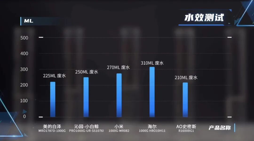 而出水量数据则为美的2.3L/min,小米2.6L/min,沁园3L/min,海尔2.4L/min。从测试结果出发,同样是大通量产品,但实际出水速度有着一定差距。沁园的净水器流速和出水量大于另外几款产品的。可别小看了这看似只有零点几升的流量差距,就几款净水器数据来说,同样接满一壶水,沁园与最后一名的差距,后者至少要站在净水器前多刷几条条短视频。当下厨下净水器净水中,RO反渗透为主流技术。但受制于RO膜的性能特性,难免会产生废水。考虑到净水器产品基本都带有纯水回冲的设计,对五台产品进行净废水比实验。具体方式为打开龙头后,在净水器稳定流出净水和废水的情况下,观察用量筒接取500ml纯水,所实际产生的废水。就结果来看,官方宣称的数值和实测的都有一定出入,主要是因为国标测试的条件和模拟测试的条件差异导致的,总的来说,各家产品的净废水比都不错。![]()