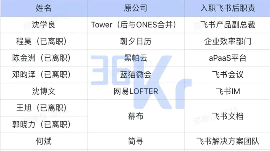 2021年,齐俊元从阿里云离职,据36氪获悉,齐俊元当时计划在软件领域再次创业。如今,齐俊元加入飞书,正值飞书快速发展、招兵买马之时。2020年的疫情,让协同办公市场进入高速增长期。当时,已经成立数年的钉钉和企业微信,用户量因为疫情顺势起飞——企业微信仅用了9个月,用户量就从6000万增长至2.5亿;时任阿里云总裁张建锋也曾公布过一个数据:疫情期间钉钉增加了1亿用户。飞书并未把握住这波移动办公大潮带来的增长机遇。用户规模与活跃度是协同办公领域重要的考核指标,从这两个维度看,飞书距离钉钉、企业微信仍有距离。据QuestMobile数据,截至2022年11月,钉钉的月活用户数(MAU)达2.53亿,企业微信为1.1亿,飞书为930万。为了奋起直追,字节跳动对飞书进一步投入,首先是巨幅扩大团队规模——飞书团队人数从2021年的超2000人,增长至2022年超8000人。对比之下,钉钉人数为1500人左右,企业微信则只有数百人规模。但要打仗,仅仅招人并不足够,更需要有经验、有资源的角色来“排兵布阵”。一位飞书员工对36氪表示,飞书人数团队人数快速增长,但中层比例并不足,尤其缺乏懂To B、能带团队的大将。对于以短视频等To C业务起家的字节跳动来说,想要快速补齐To B业务短板,“钞能力”是最有效率的方式。据36氪初步统计,从2018年开始,字节跳动在协作、文档、会议等领域展开频繁收购与投资,将多位创始人招至麾下——包括朝夕日历创始人程昊、黑帕云创始人陈金洲、Tower(后与ONES合并)创始人沈学良、蓝猫微会创始人邓昀泽等,他们均作为飞书重要业务板块的负责人。选择“砸钱收大将”,背后原因还在于,在产品策略上,飞书已经和钉钉、企微走向截然不同的方向。钉钉在经历“云钉一体”后,正在逐渐加深与阿里云的联动,喊出“只做平台不做SaaS”,大力拓展生态;而企业微信基于C端的连接,其产品落点已紧密围绕消费端场景的“私域流量”。但飞书选择了“All in One”路线。除了传统的办公套件外,飞书还自己下场做了人事、报销等极其复杂的企业服务产品——对尚处于投入期的飞书而言,直接收购成熟团队,无疑是补齐业务板块、夯实产品最快速的办法。不过,从2016年起以内部协同工具起家,到后来决定以“Lark”为出海,再到2019年转向国内,飞书不断调整战略之时,也伴随着中高层的流失加剧。据36氪获悉,2018年飞书收购幕布后,两位创始人均于2021年离开飞书,重新创业;2022年,字节收购无代码公司“黑帕云”,创始人陈金洲入职飞书仅数月后便离职;此前加入飞书的蓝猫微会创始人邓昀泽也已经离职。对飞书而言,下一步的挑战可能并不在于如何找人,而是如何在快速追赶的同时,留住这支豪华的To B团队。![]()