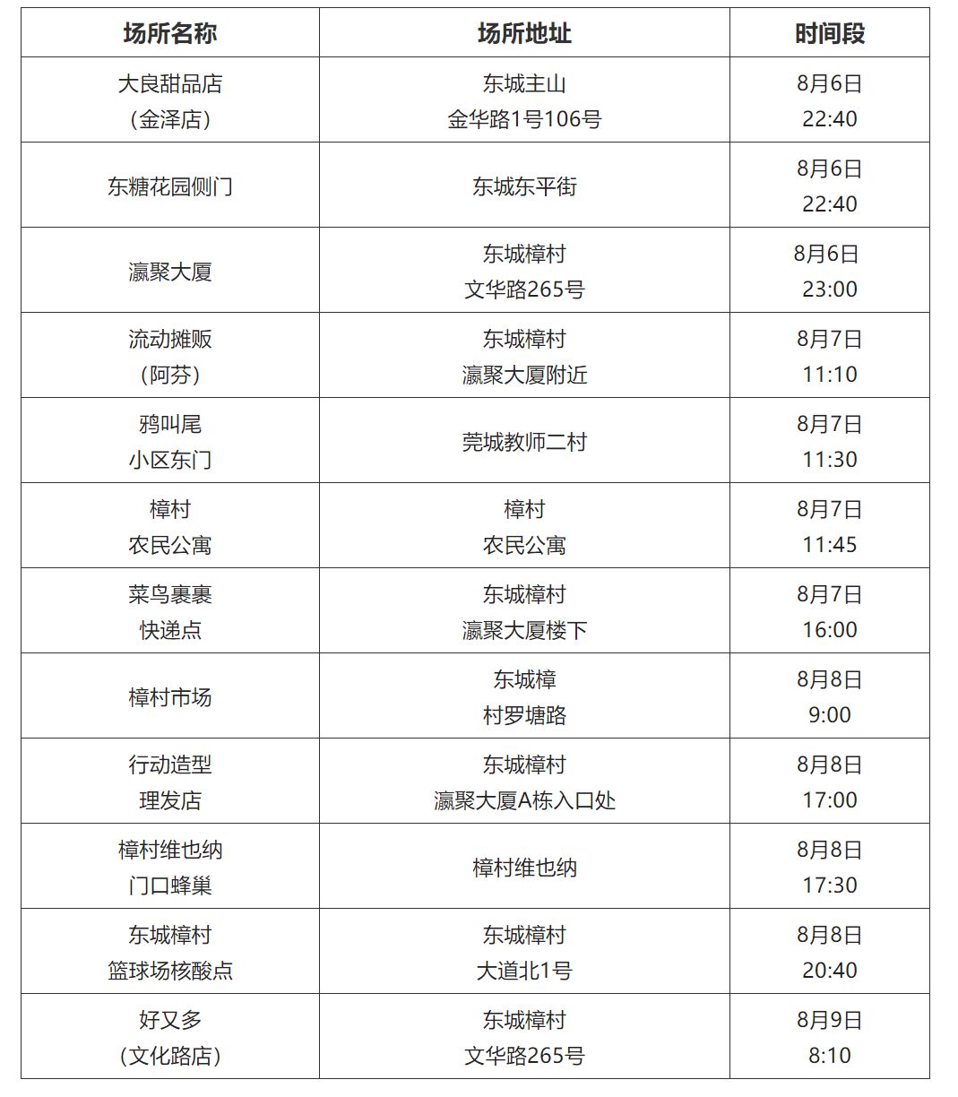 东城樟村篮球场核酸检测点(东城樟村大道北1号),8月8日20:40—21:01,20:51—21:10;