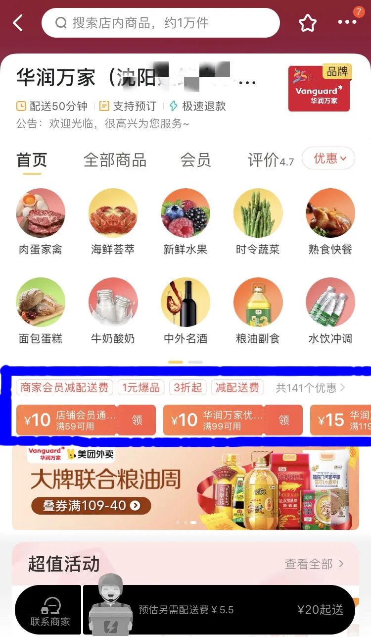 美团买菜主要有两种优惠:品类满减及店铺满减。