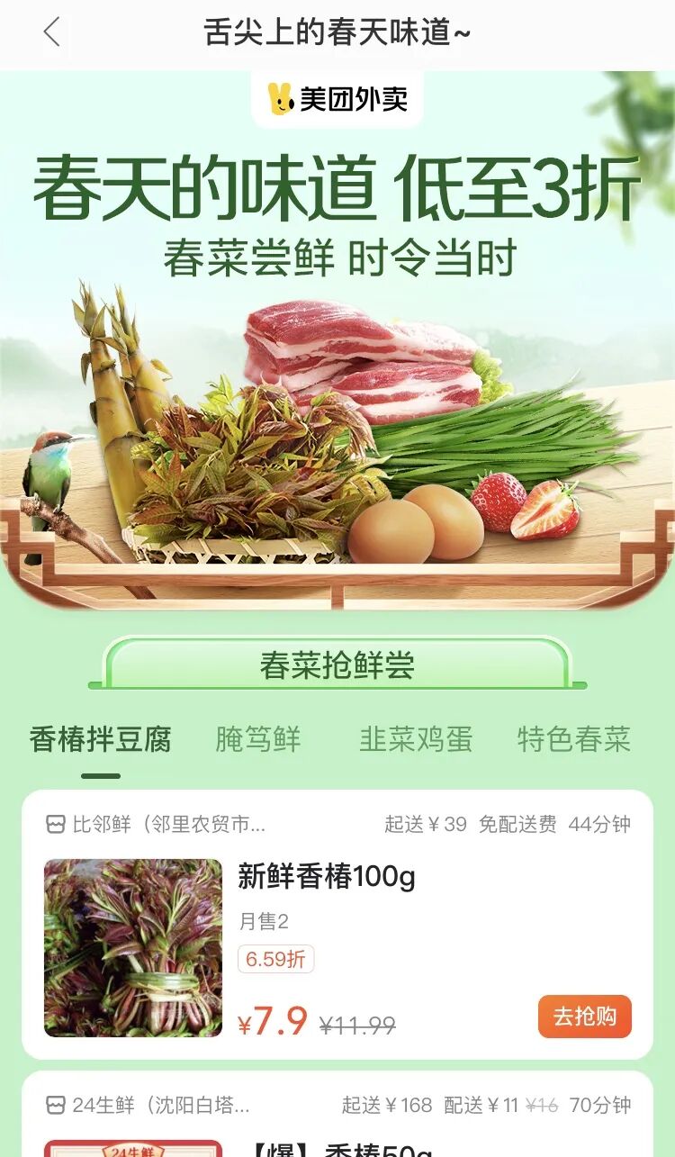 优势:大型商超、小型菜场店铺繁多、春季尝鲜优惠、品类满减、配送快捷
