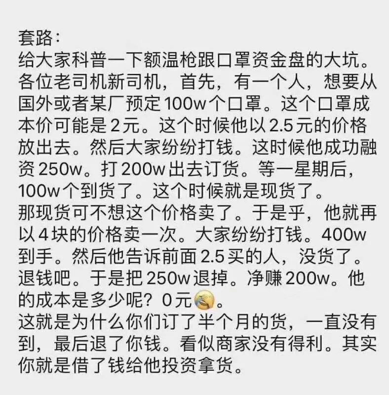 这个事儿,我一直希望和这个弟兄细聊一下,可他起初答应,后来,就不怎么搭理我了。其二:挣钱应该早不止400万,财不外露,没必要高调。其三:特殊时期,口罩这个生意,即使本来就是正规的做,但依然背负较大的道德压力,低调为好。