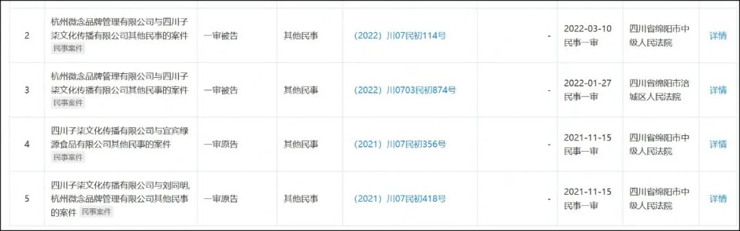 2022年3月底,微念与子柒文化再新增一则立案消息,原告为杭州微念,被告为子柒文化,经办法院为四川省绵阳市中级人民法院。