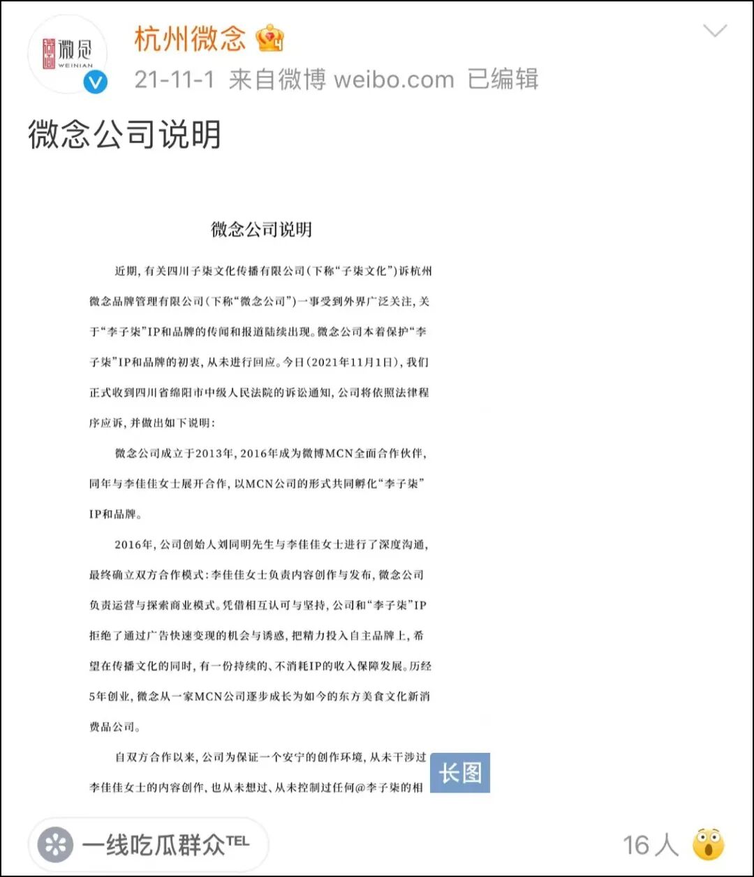 2021年11月,据“杭州微念”官方微博发布说明称,2016年,公司创始人刘同明先生与李佳佳女士(李子柒)进行了深度沟通,最终确立双方合作模式。