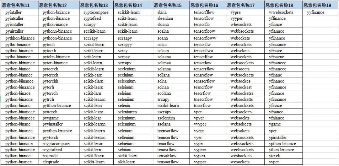 其中一些遭假冒的流行包包括bitcoinlib、ccxt、cryptocompare、cryptofeed、freqtrade、selenium、solana、vyper、websockets、yfinance、pandas、matplotlib、aiohttp、beautifulsoup、tensorflow、selenium、scrapy、 colorama、scikit-learn、pytorch、pygame和 pyinstaller。