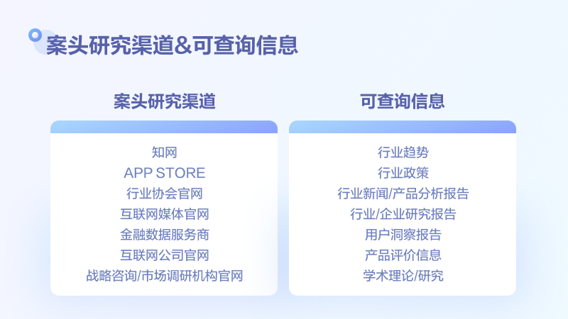案头侧指标收集方式主要是案头研究和产品走查。案头研究可重点关注成熟评估模型以及行业趋势、产品模式和用户需求分析报告,结合对产品的走查分析,提炼“好的产品体验”需要包含哪些要素。常用的案头研究渠道和可查询的信息如下图:
