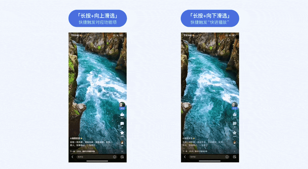 「长按+向下滑选」快捷触发“快进”(一定程度上兼容老用户对于此功能的使用习惯)。
